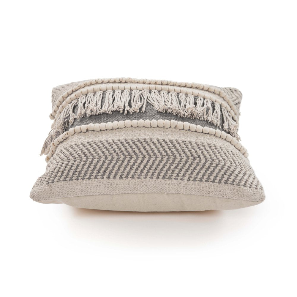 The 20-inch beige and ivory throw pillow with fringe is the perfect decorative accessory for your home. The beige and ivory coloring of the extremely durable and long lasting cotton will add dimension and texture to your space. Super soft and built to hold its shape, this polyfill-filled pillow is a great option. Decorative pillows are a great way to change up the look and feel of your space easily and quickly. A great decorative accessory to add color and dimension to your favorite chair, accent your sofa, or to use as part of your bed ensemble. 20-inch h x 20-inch w x 4-inch d.
