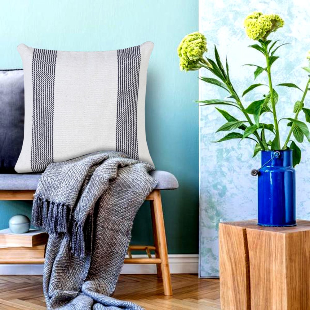 This 20-inch blue and white beach striped cotton throw pillow cover will add a beautiful decorative accent to your decor. The blue and white coloring of the extremely durable and long lasting cotton pillow cover will add dimension and texture to your space. Pillow covers are a good idea for anyone that loves to decorate or accent their space with color and texture. Combine with your own fill or insert to add decoration and dimension to your favorite chair, accent your sofa, or to use as part of your bed ensemble. 20.00-inch h x 20.00-inch w x 0.50-inch d.