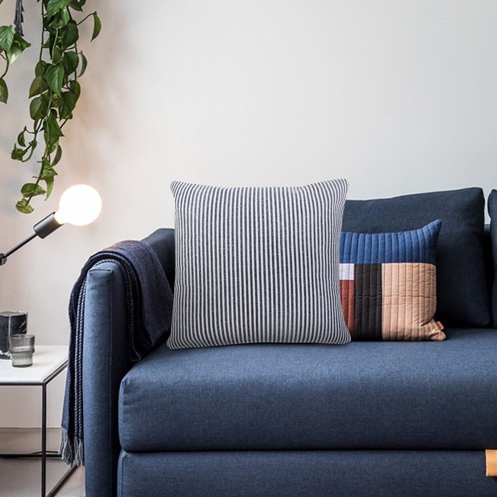 Bring a bit of fashion and zip to your space with this eye-catching and comfy 20-inch blue and white striped cotton throw pillow cover. Durable blue and white cotton has been used to give this pillow cover a beautiful look that will stand the test of time. Decorative pillow covers are a great way to change up the look and feel of your space easily and quickly. Combine with your own fill or insert to add decoration and dimension to your favorite chair, accent your sofa, or to use as part of your bed ensemble. 20.00-inch h x 20.00-inch w x 0.25-inch d.