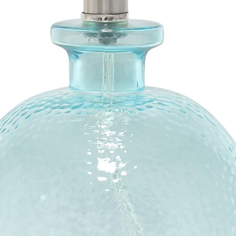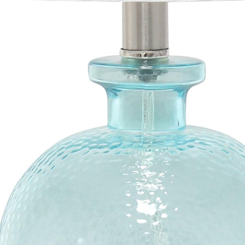 This 20-inch blue glass round table lamp with white drum shade is the perfect combination of design and function. The lamp is made of sturdy glass and features a blue color. The white drum fabric shade is a great compliment to this lamp. This standard table lamp is designed to provide general lighting to the area. High quality design makes this a great lamp for not only lighting, but accenting a room with style. It is perfect for virtually any decor. 20.00-inch h x 11.00-inch w x 11.00-inch d.