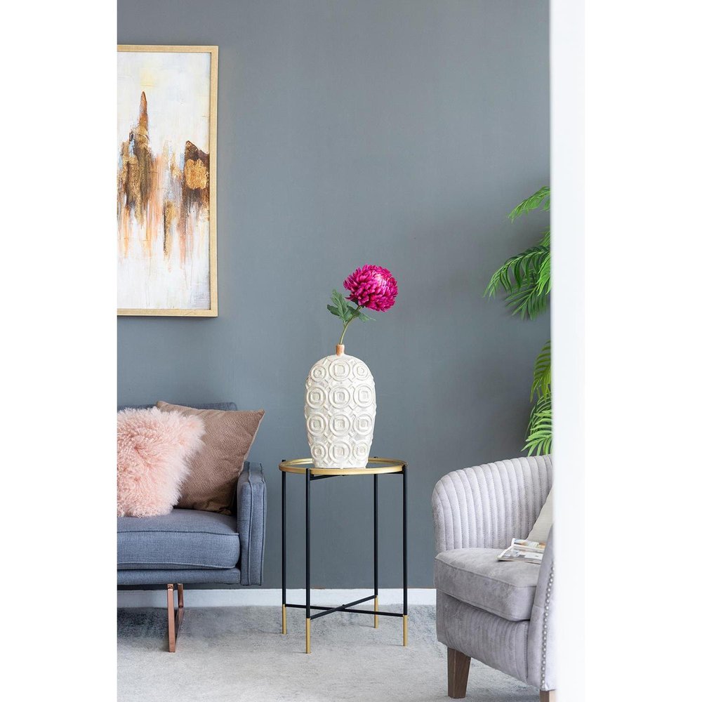 The 20-inch ivory geometric bud ceramic table vase is a stunning addition to any decor. Crafted from high-quality ceramic, this vase showcases a unique bud shape that enhances its elegant appeal. Its transitional style seamlessly blends with various interior aesthetics, making it a versatile choice for your home. Whether filled with fresh blooms or displayed on its own, this vase serves as an eye-catching centerpiece for tables, shelves, or mantels. The soft ivory hue brings a sense of warmth and sophistication to any room, creating a serene atmosphere. Elevate your living space with this beautifully designed vase that combines functionality with artistic flair. 20-inch h x 12-inch w x 5.5-inch d.