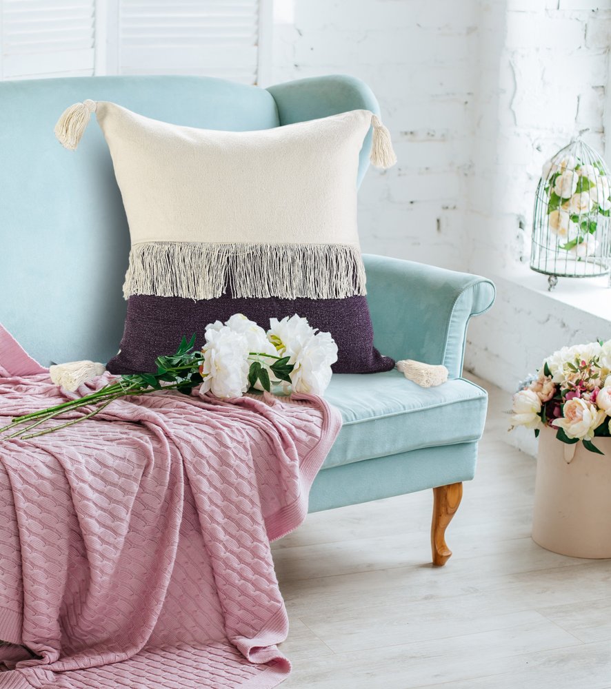 Unique and decorative, this comfortable 20-inch purple and ivory beach striped cotton throw pillow cover will leave a lasting impression. This soft and durable decorative pillow cover is expertly made of high grade, long lasting cotton in a purple and ivory coloration. Pillow covers are a good idea for anyone that loves to decorate or accent their space with color and texture. Combine with your own fill or insert to add decoration and dimension to your favorite chair, accent your sofa, or to use as part of your bed ensemble. 20.00-inch h x 20.00-inch w x 0.50-inch d.