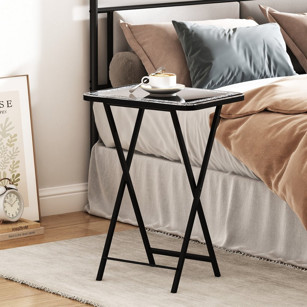 20" Silver and Black Mirrored Glass Faux Crystal And Metal Folding Tray Table