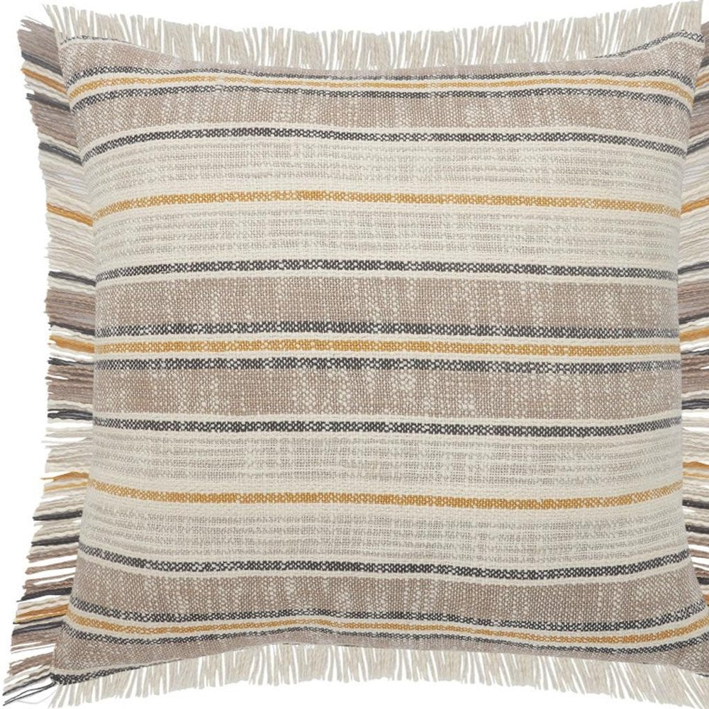 Bring a bit of fashion and zip to your space with this eye-catching and comfy 20-inch white and tan striped cotton throw pillow cover. This white and tan hued, accent pillow cover, represents quality construction, expertly made from durable cotton that is not only long lasting but soft to the touch as well. Decorative pillow covers are a great way to change up the look and feel of your space easily and quickly. Combine with your own fill or insert to add decoration and dimension to your favorite chair, accent your sofa, or to use as part of your bed ensemble. 20.00-inch h x 20.00-inch w x 0.50-inch d.