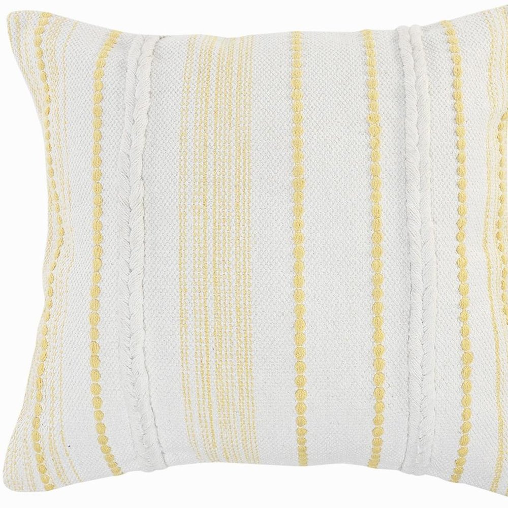 The perfect complement to your sofa, favorite chair, or bed, this 20-inch white and yellow striped cotton throw pillow cover is a great decorative accent. This soft and durable decorative pillow cover is expertly made of high grade, long lasting cotton in a white and yellow coloration. Decorative pillow covers are a great way to change up the look and feel of your space easily and quickly. Combine with your own fill or insert to add decoration and dimension to your favorite chair, accent your sofa, or to use as part of your bed ensemble. 20.00-inch h x 20.00-inch w x 0.50-inch d.