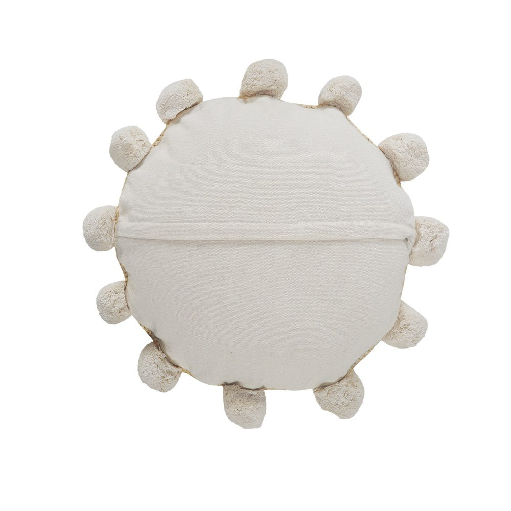 This 20-inch x 20-inch brown jute and cotton round throw pillow with pompoms will add a beautiful decorative accent to your decor. Crafted with natural textural jute on the front and large pom poms, this unique boho chic pillow will be a great decorative addition to your space. This soft polyfill filled pillow not only is decorative but made to be comfy and cozy all day long. Charming decorative pom-poms give this design some fun, along with a hand-crafted look and feel. Decorative throw pillows not only add color and dimension to your space but can be comfy and supportive when you are lounging and cuddling as well. 20-inch h x 20-inch w x 4-inch d.