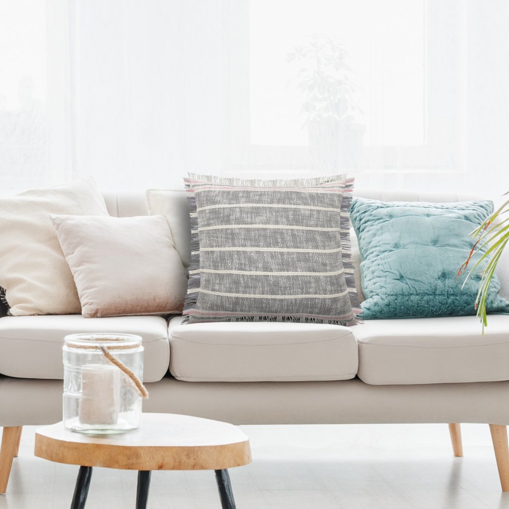 Add an air of fashion to your room and rejuvenate the space with this cute and fashionable 20" x 20" gray white and pink 100% cotton striped zippered pillow. This gray white and pink hued piece represents quality construction, expertly made from premium 100% cotton that is not only long lasting but super soft to the touch as well. For anyone that loves to decorate or accent their space with color and texture. A great decorative accessory for your favorite chair, to accent your sofa, or to use as part of your bed ensemble. 4" H x 20" W x 20" D
