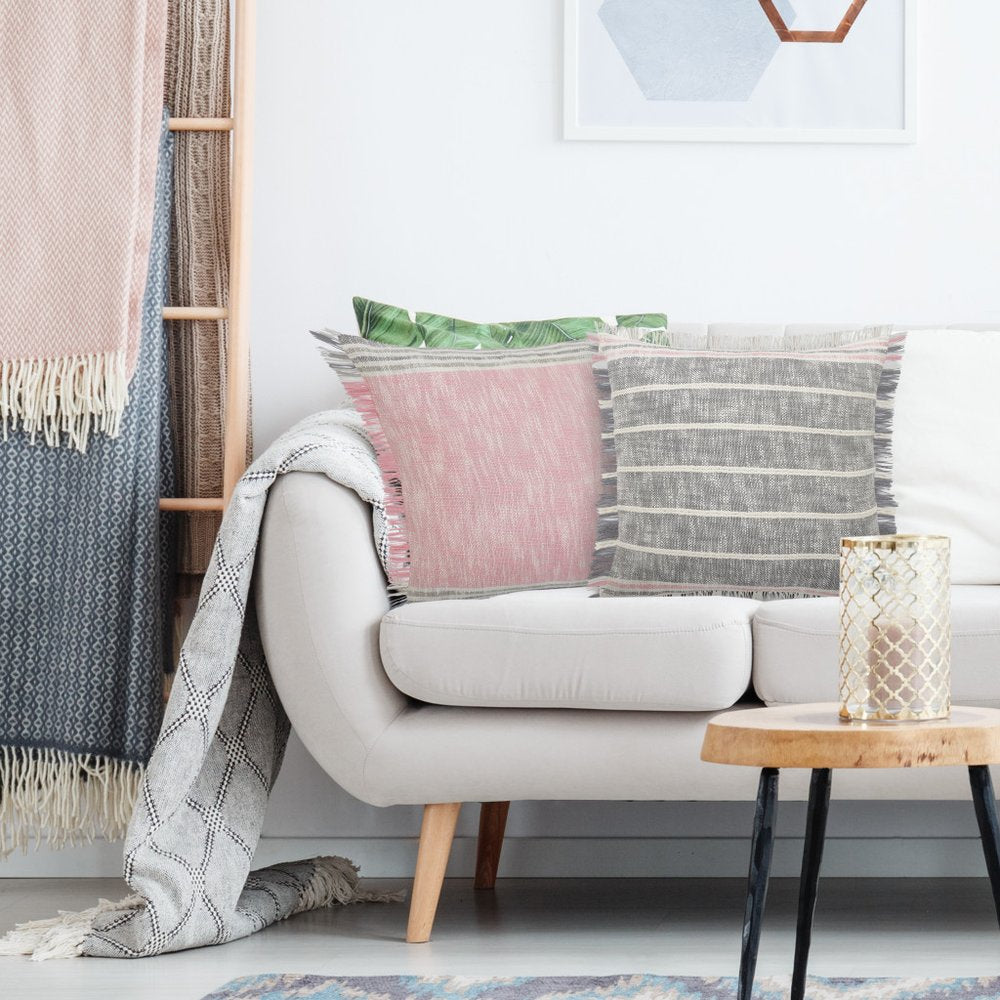 20" X 20" Gray White And Pink 100% Cotton Striped Zippered Pillow