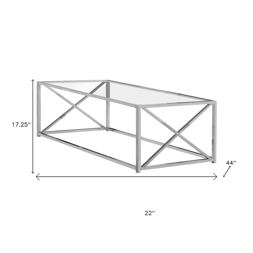 Give your living room, family room, or office the perfect anchor piece with this 22-inch clear and silver glass and iron coffee table. The clear glass top of this table is a nice visual contrast to the high quality, silver iron of the base. This classic rectangular table will be a great accent in any room it has a fresh design that will definitely breathe some fresh air into your interior. This coffee table is the sturdy, reliable and stylish answer to your living room needs. 17.25-inch H x 22-inch W x 44-inch D