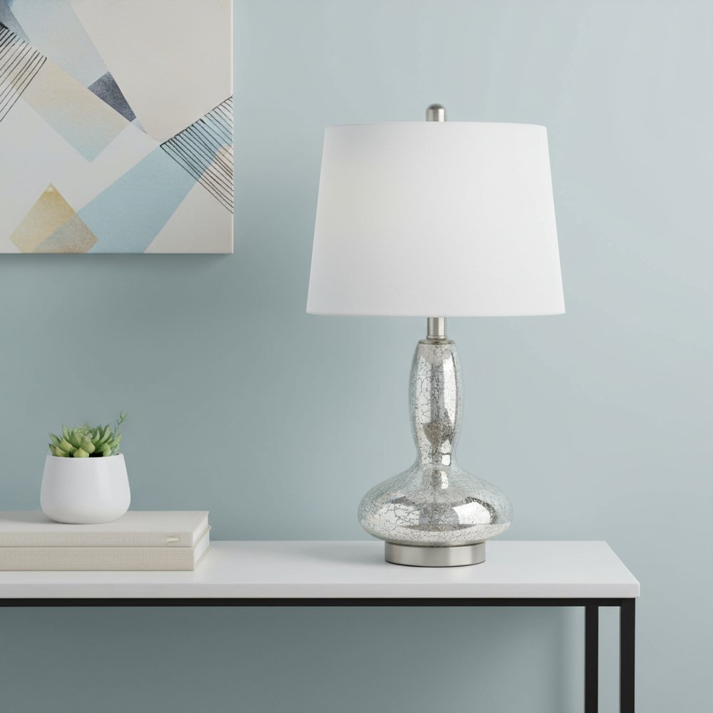 Embrace the good life with this hard working and stylish 23-inch clear and silver glass and metal novelty table lamp with white drum shade. The base of this lamp is made of clear and silver glass and metal. The white shade has a drum shape and is made of fabric, which makes it a perfect choice. This standard table lamp is designed to provide general lighting to the area. High quality design makes this a great lamp for not only lighting, but accenting a room with style. It is perfect for virtually any decor. 22.75-inch h x 13.00-inch w x 13.00-inch d.