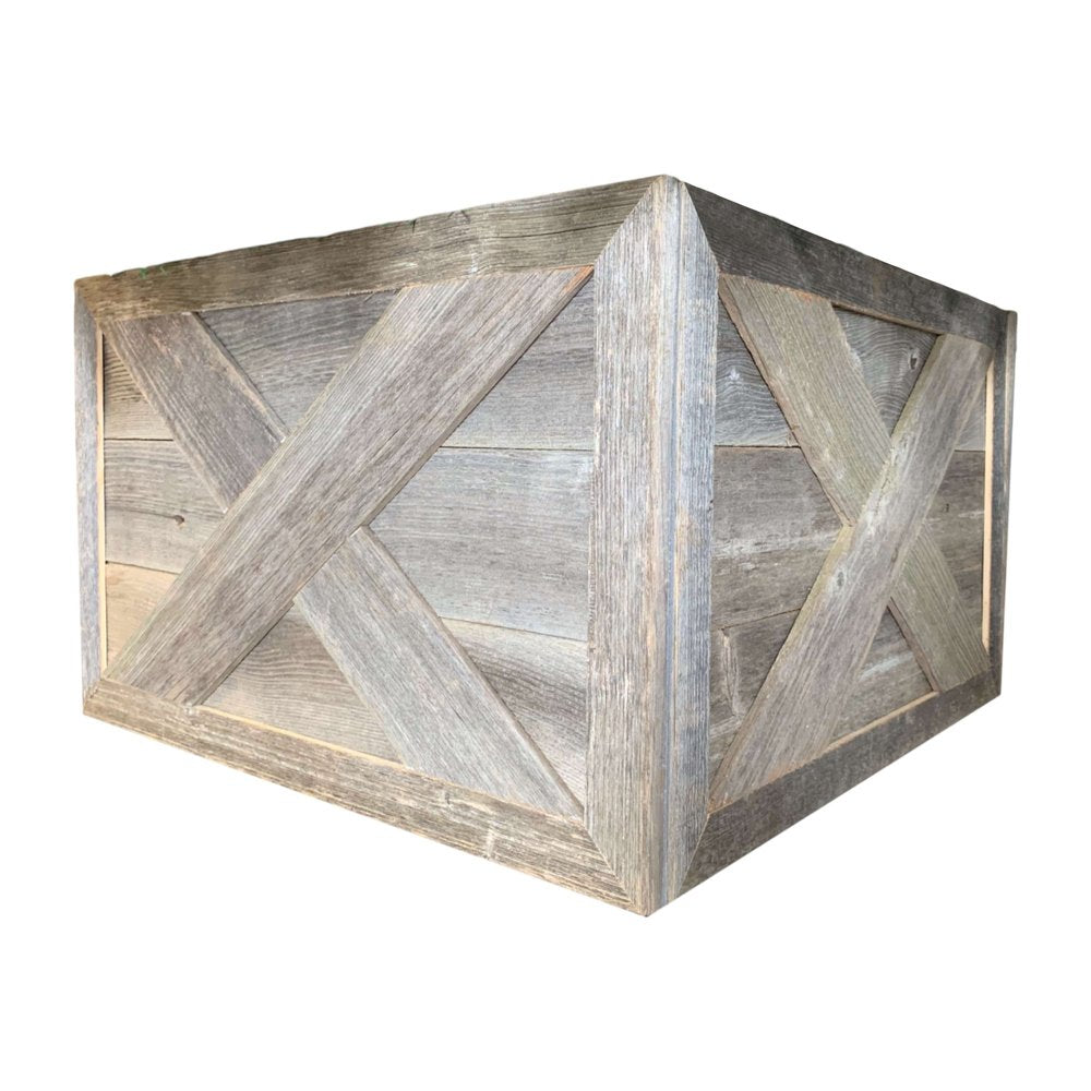Change up the look of your room with this gorgeous gray distressed wood Christmas tree collar. This modern farmhouse inspired collar goes around your Christmas Tree Stand to give your tree and the room an updated and designer feel. The X design on each side adds a rustic and charming touch. Replace the traditional tree skirt with this vintage looking box made of genuine recycled and reclaimed wood. 14.5-inch h x 22.5-inch w x 0.5-inch d.