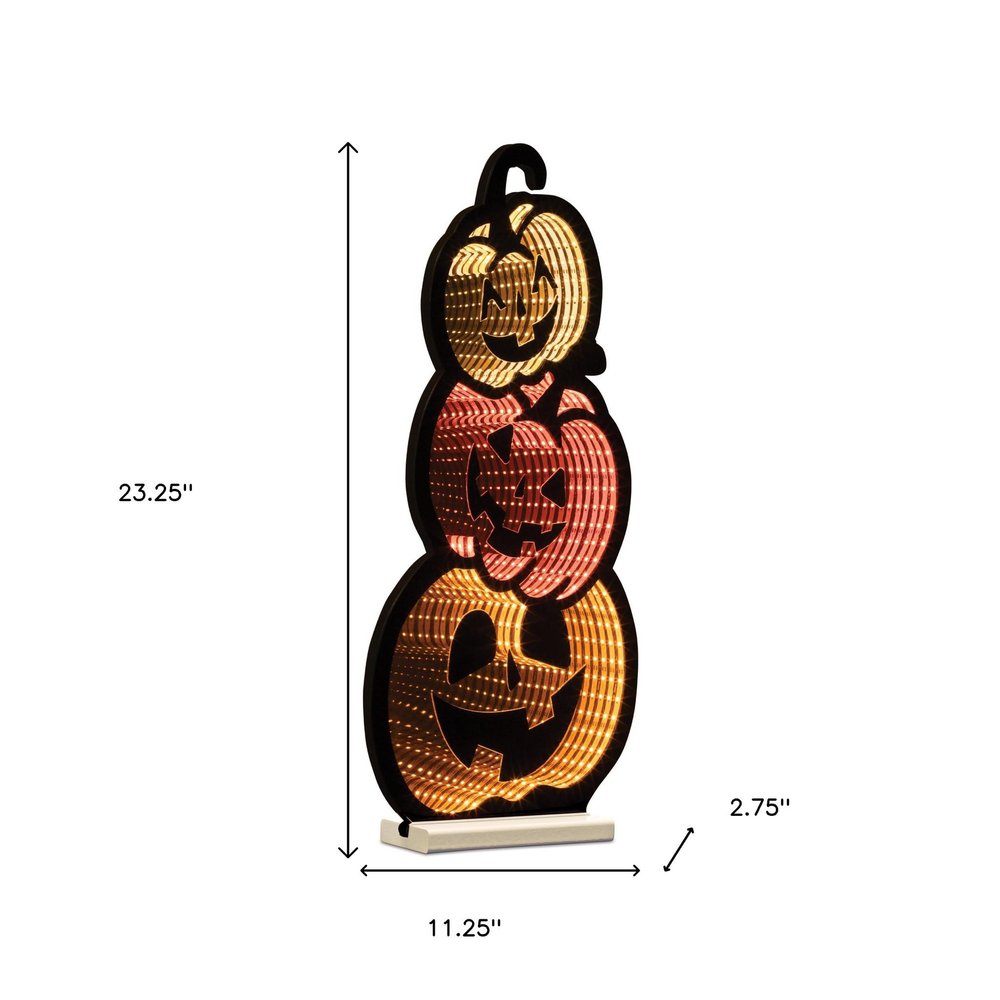 Bring a warm and festive fall feeling to your space with this 23-inch orange black and yellow acrylic halloween jack-o-lantern tabletop sign with led. Led light provides an illuminating effect that adds to the decorative appeal of this special piece. A perfect decorative addition for anyone who loves a stylish look and feel. 23.25-inch h x 11.25-inch w x 2.75-inch d.
