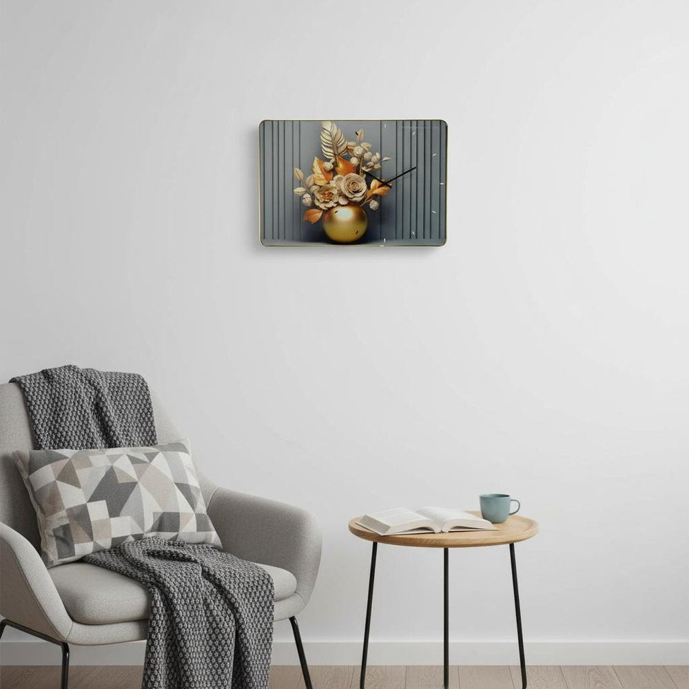 This 24-inch beige gold and gray solid wood and acrylic silent analog floral wall clock includes three moving hands on the face that move smoothly to indicate the hour, minute and seconds. Features a practical, curved-edged rectangle shape and a contemporary floral pattern. The clock face not only looks good but is made from sturdy acrylic that will stand the test of time. Elevate the decor of any room in your house. The eye-catching makeup of this clock will ensure that you never run late again. 15.5-inch h x 23.5-inch w x 1.5-inch d.
