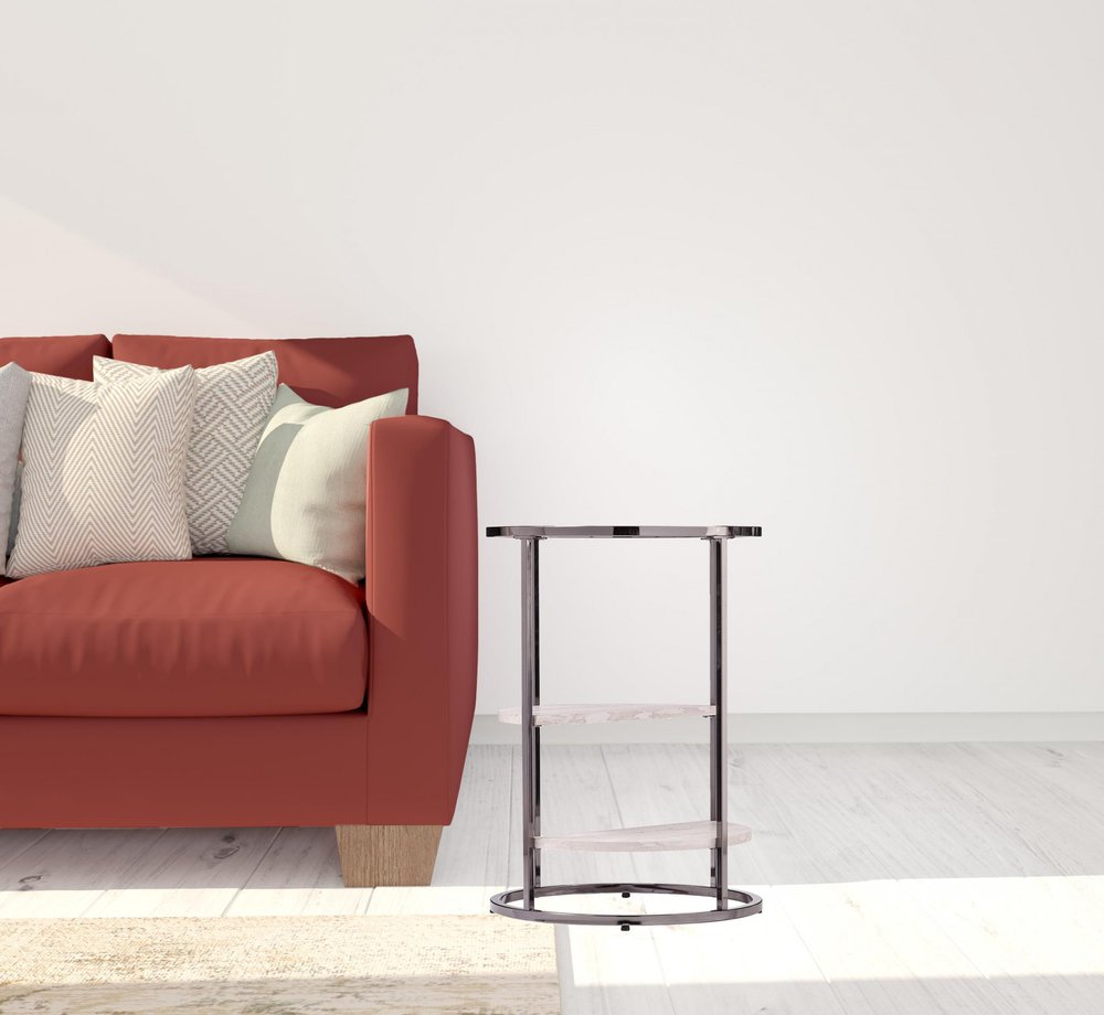 Distinctive in style, the 24" black metal, glass and faux travertine marble round end table with two shelves radiates a versatile charm. This multi-functional end or side table is built to last and is super unique with geometric designs. The black coloration looks cool with the clear glass and marble like half moon shelves. Includes two shelves for additional storage or display space. A great accent on either side of the sofa or bed, this adorable end or side table is just what you need. You can match it with other pieces to get the ideal look for your place. 24" H x 17" W x 17" D