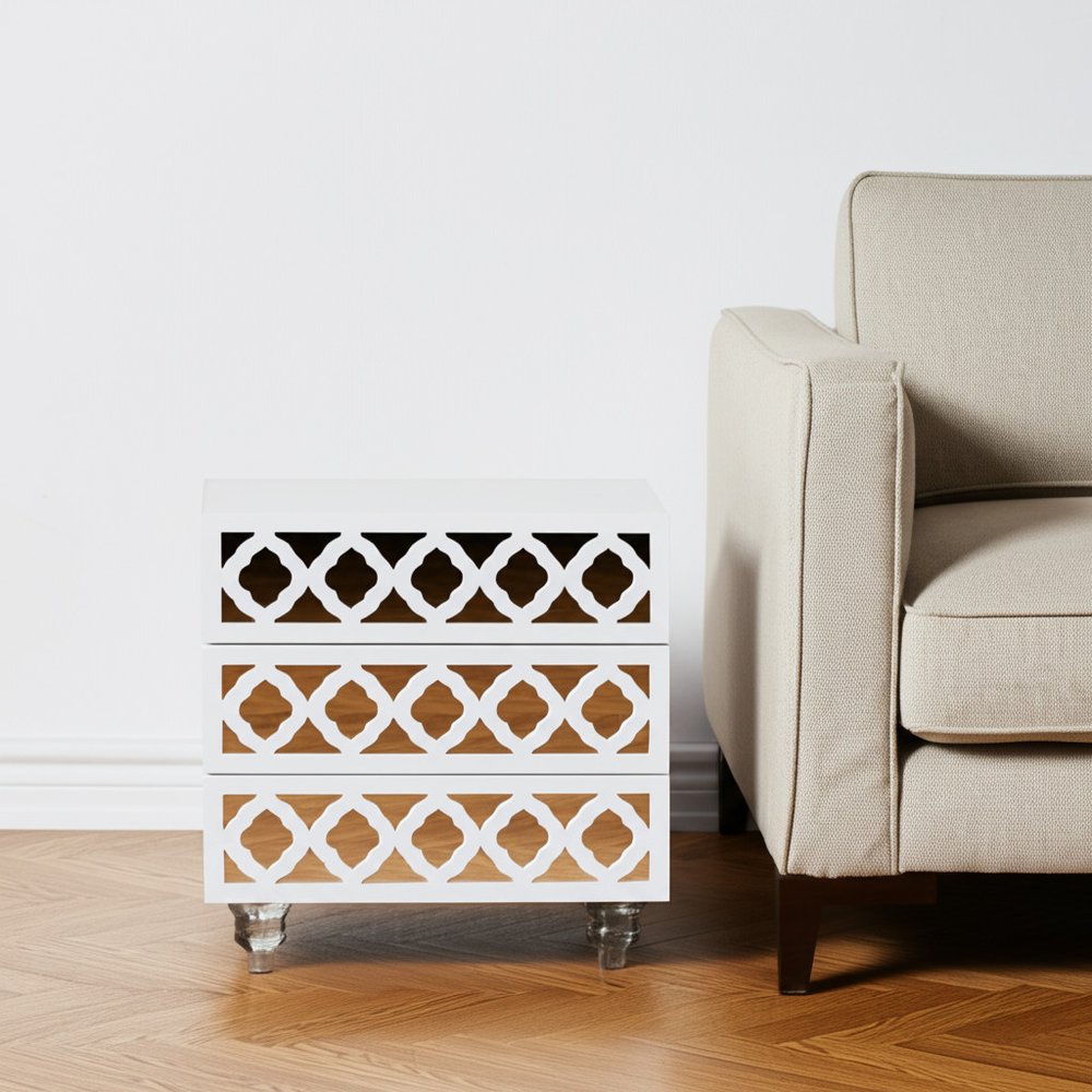Distinctive in style the 24-inch clear and white mirrored end table with three drawers radiates a versatile charm. Offering a nice color combination, the top of this manufactured wood table is white, while the base compliments it nicely in clear. Reflective pieces of mirrored glass give this table a glamorous and unique look. Includes 3 easy open drawers for storage of the small essentials. Side tables are a great way to flank your sofa, use as an accent next to your favorite chair, or can even be used bedside. You can also use it as an entryway table to hold your keys. 24-inch H x 24-inch W x 18-inch D