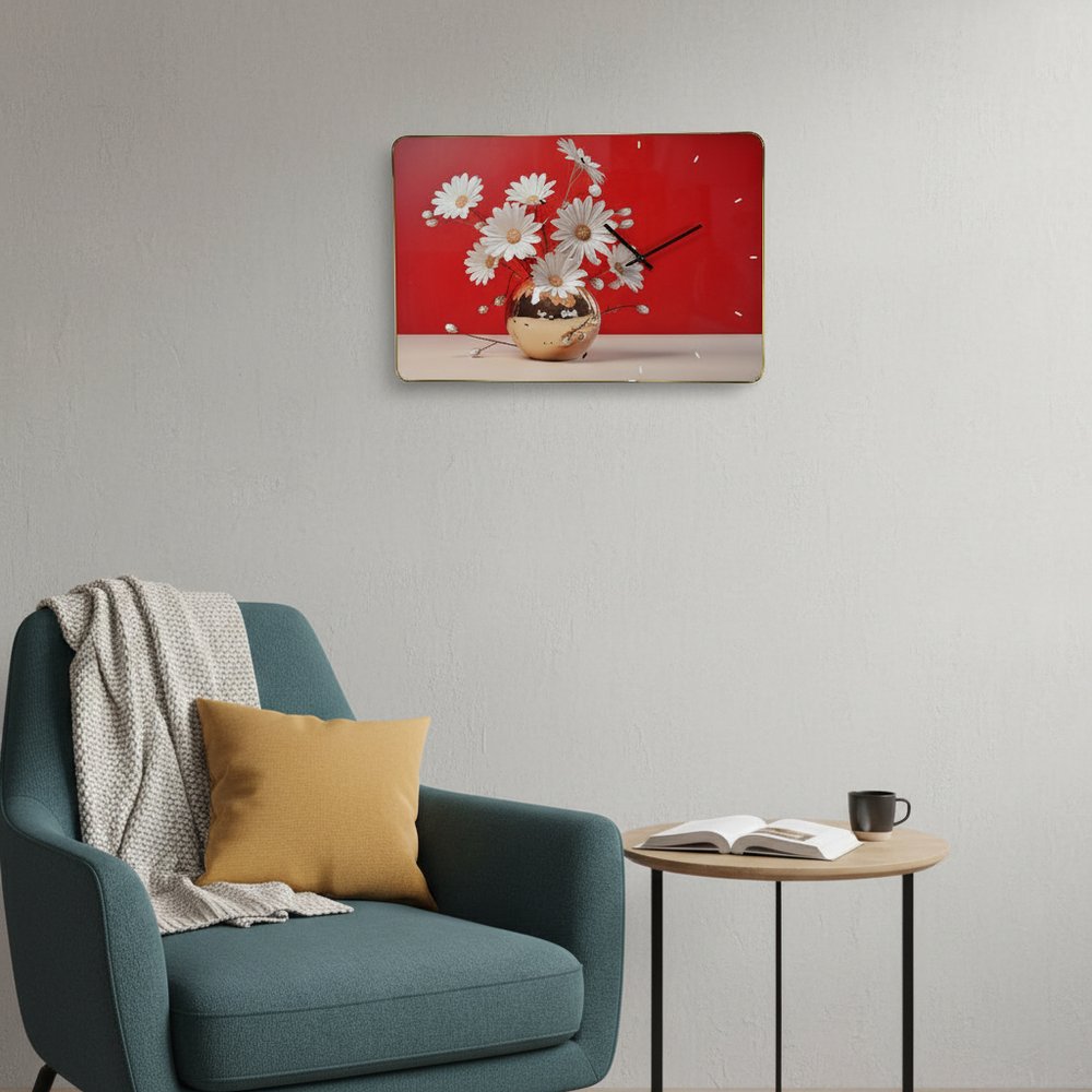 This 24-inch gold red and white solid wood and acrylic silent daisies floral wall clock includes three moving hands on the face that move smoothly to indicate the hour, minute and seconds. Features a practical, curved-edged rectangle shape and a contemporary daisies in a gold round vase design. The clock face not only looks good but is made from sturdy acrylic that will stand the test of time. Stay on track with this elegant and efficient clock. With its unique design and practical purpose, this clock will add flair to your home while also acting as an essential tool. 15.5-inch h x 23.5-inch w x 1.5-inch d.