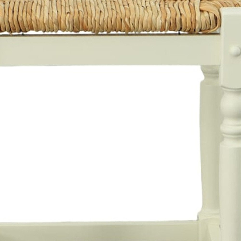 Comfort and design come together nicely in this 24-inch natural and antiqued white solid wood backless counter height bar chair with footrest. The natural rush seat of this stool is a nice contrast to the high quality, antiqued white solid wood of the base. The square shape of the seat give this backless chair a fresh and fashionable look. Designed with a footrest for comfort and convenience. 24-inch H x 16.5-inch W x 16.5-inch D