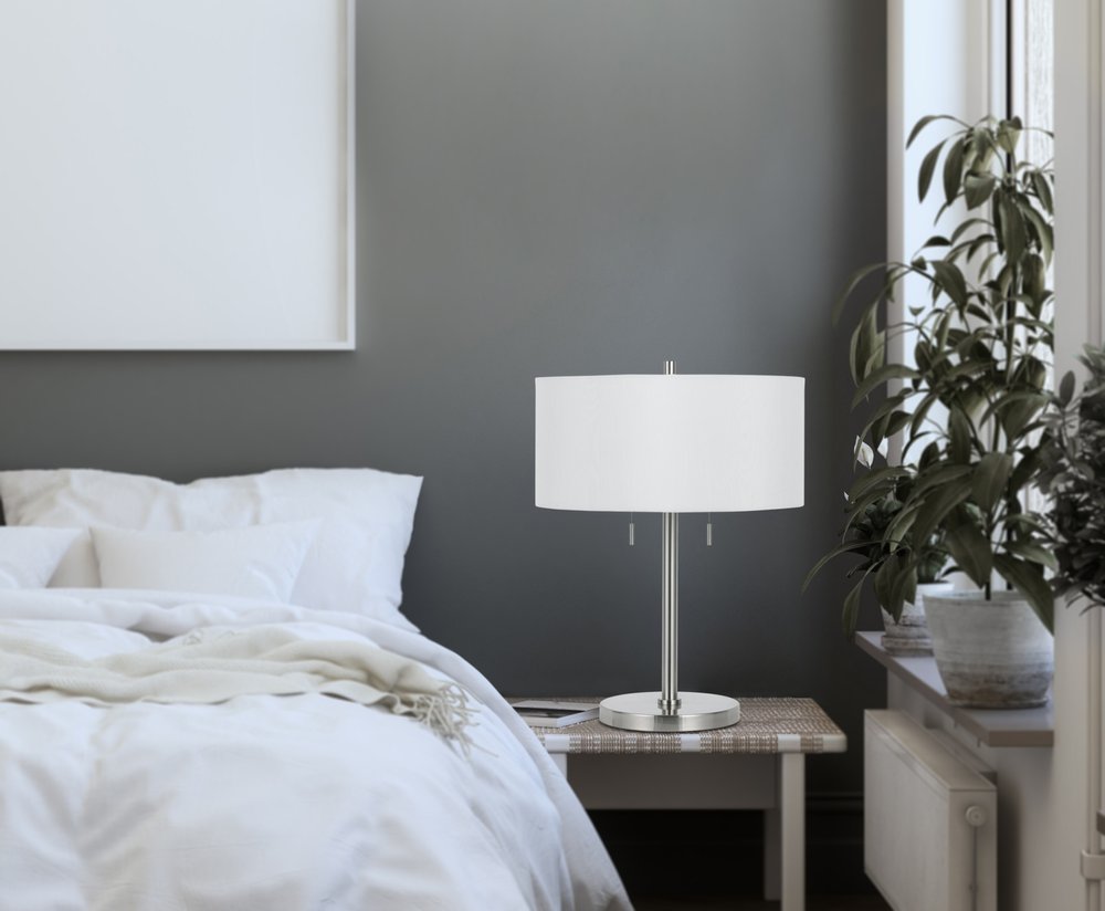 Embrace the good life with this hard working and stylish 24" nickel metal two light table lamp with white empire shade. The base of this lamp is made of nickel metal. The white empire linen shade is a great compliment to this lamp. This standard table lamp is designed to provide general lighting to the area. The light that this lamp throws is soft and warm to elevate the look of most any space in your home. It is perfect for virtually any decor. 23.5" H x 17" W x 17" D