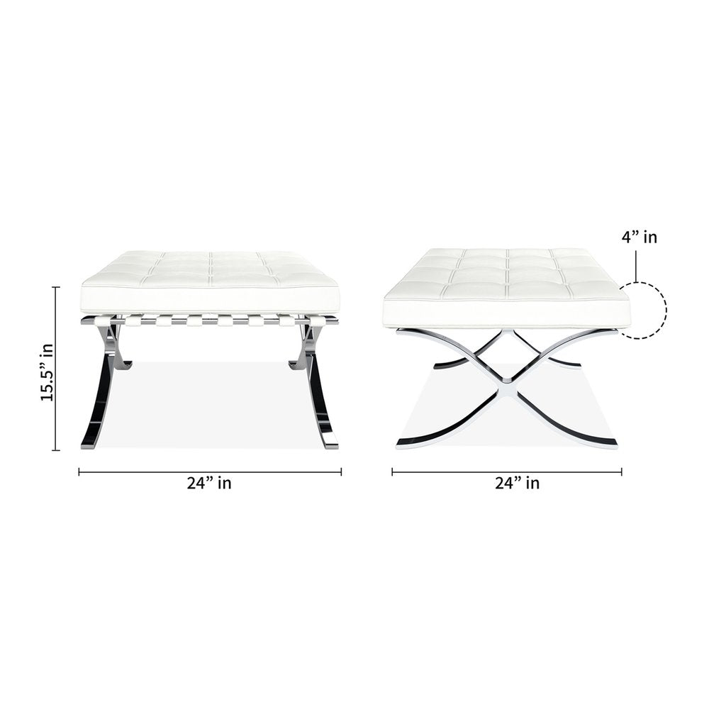 Get ready to relax with this 24-inch white genuine leather and silver tufted footstool ottoman. This footstool is a treasure at the end of the day as an ideal place to rest your feet and legs and can also be used for extra seating when needed in a pinch. A shiny silver stainless steel frame is finished off with a white upholstered seat that is the epitome of quality construction and design. Expertly upholstered with padding in a soft solid color genuine leather, this ottoman is as comfortable as it is good looking. 15.5-inch H x 24-inch W x 24-inch D