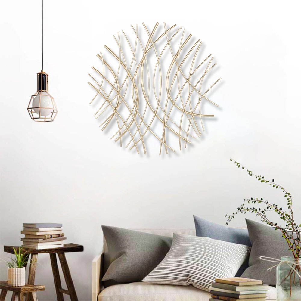 Add an air of fashion to your room and rejuvenate the space with this 24-inch x 24-inch gold metal circle abstract hanging dimensional sculpture. Easily create a focal point in your room with this circular shaped modern decor that features a unique and abstract design. Handmade with care, this piece brings some authenticity to your surroundings. Instantly liven up your space with this art that brings color and dimension to your walls. 24-inch h x 24-inch w x 1.25-inch d.