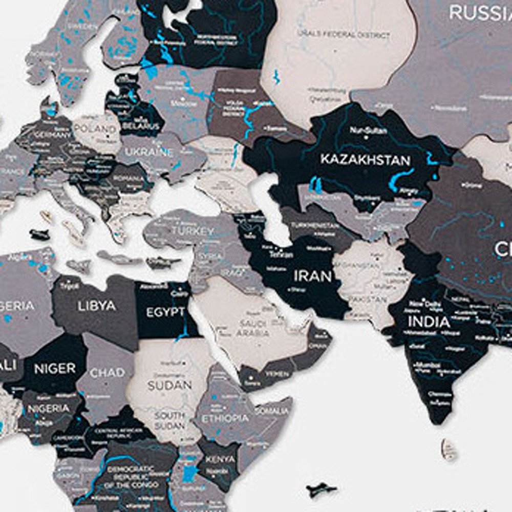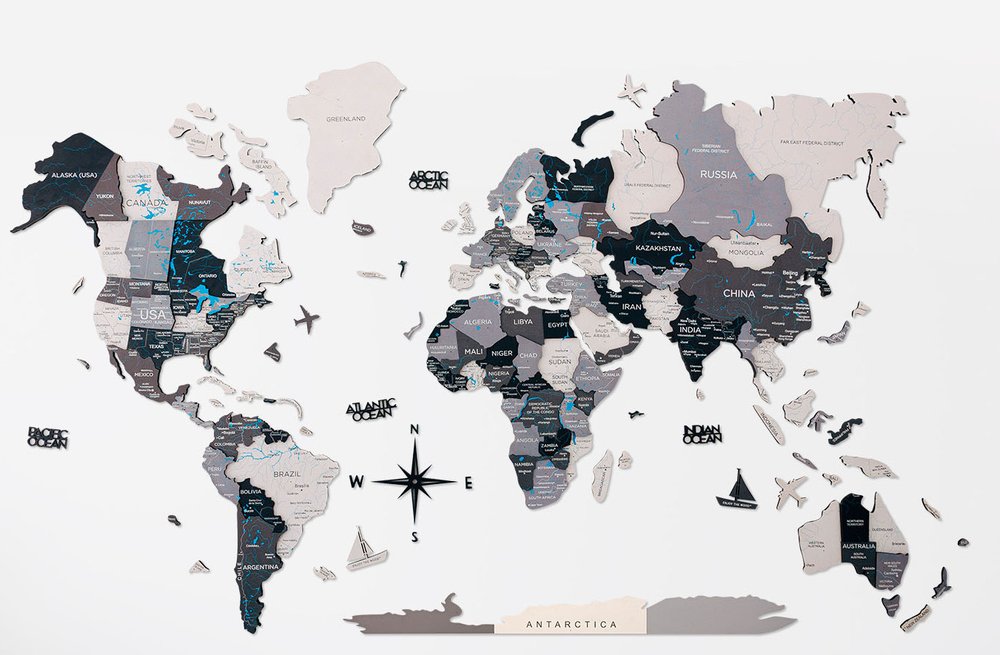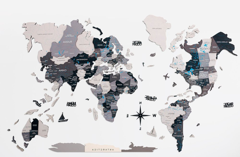 24" X 39" Black Gray and White Wood World Map Hanging Dimensional Sculpture