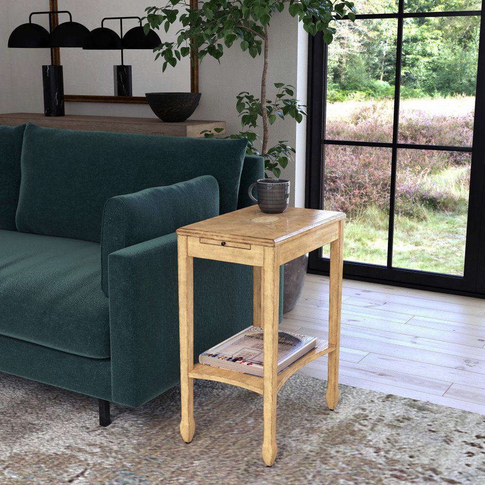 Show off your exquisite taste with this 25" beige manufactured wood rectangular end table with shelf. A solid beige solid and manufactured wood frame is finished off with a matching beige manufactured wood seat, giving this table a chic monotone look. Complete with a purposefully distressed finish, this table has an aged, vintage, and rustic feel. Help to keep your space organized with the included single shelf. A great accent on either side of the sofa or bed, this adorable end or side table is just what you need. You can match it with other pieces to get the ideal look for your place. 25" H x 12" W x 18" D
