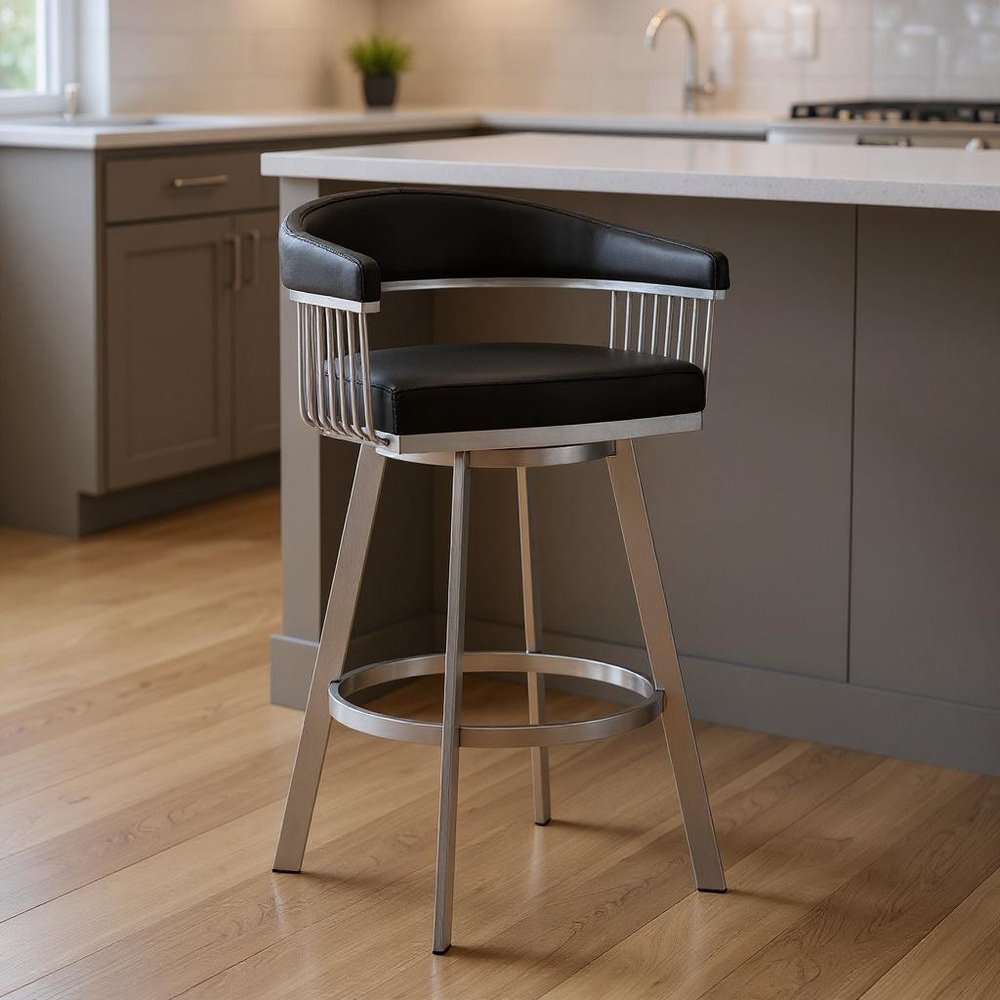 This 25-inch black and silver iron swivel backless counter height bar chair with footrest will be the perfect way to add some cool design and utility to your space similar to what you find in your favorite cafes or pubs. A silver iron frame is finished off with a black fabric seat that is the epitome of quality construction and design. A backless mixed with a round shaped seat makes this chair both comfortable and fashionable. Designed with armrests for your comfort, this chair also features a footrest for comfort and convenience. 34-inch H x 22-inch W x 21-inch D