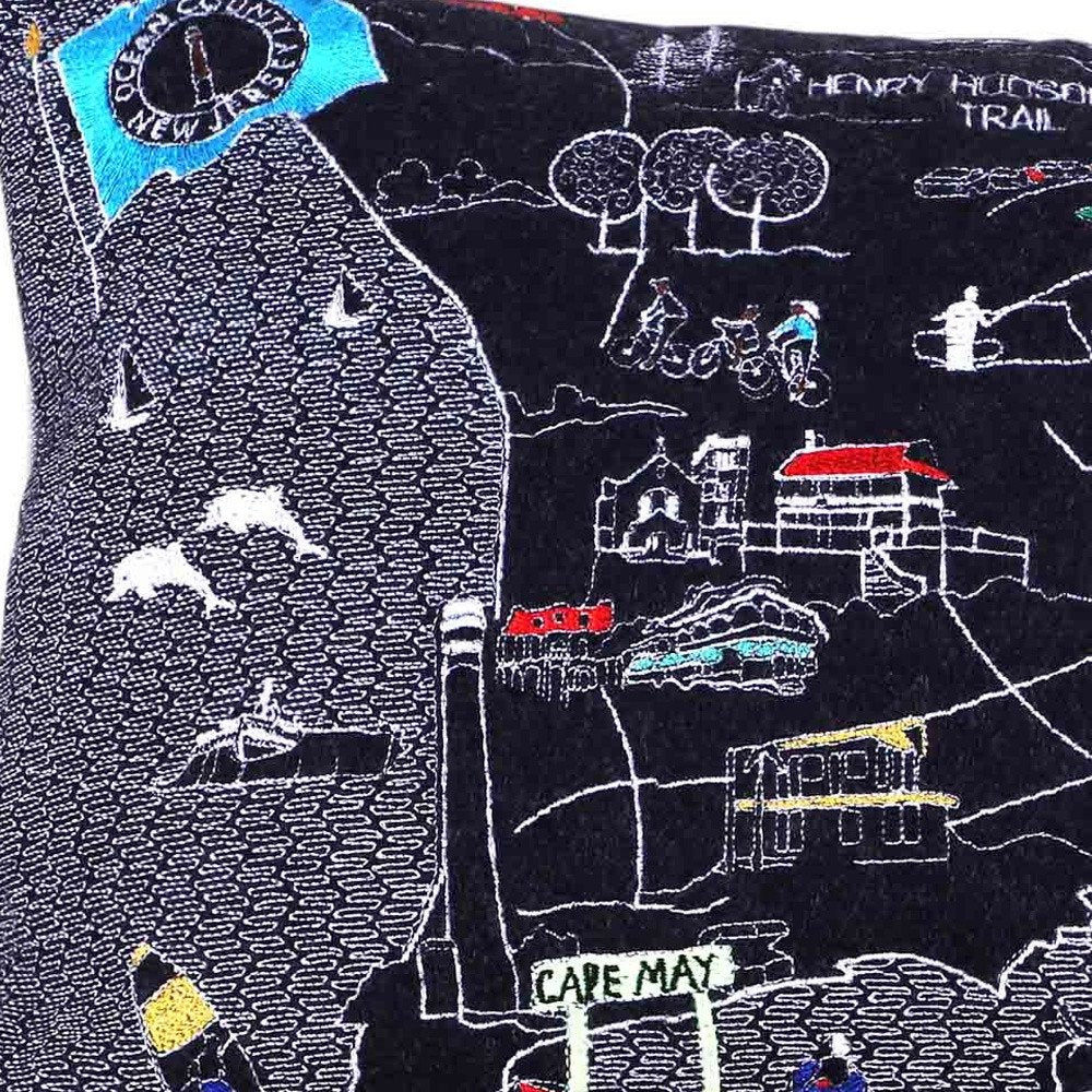 Showcase one of the most famous cities in the world with our Black Jersey Shore Nighttime Skyline Lumbar Decorative Pillow. This nighttime view depicts New Jersey's famous coastline and includes many popular tourist vacation destinations. The gorgeous coastline features many famous landmarks stretching from Long branch down to Cape May, rendering in a modern whimsical way to bring this iconic coast to life. Made of a wool/nylon blend, this high quality stitched decorative pillow features white on black embroidered artwork mixed with pops of color that highlight important and recognizable icons from the infamous Jersey Shore. This pillow makes a great gift, decorative accent and conversation piece. 14-inch H x 25-inch W x 4-inch D