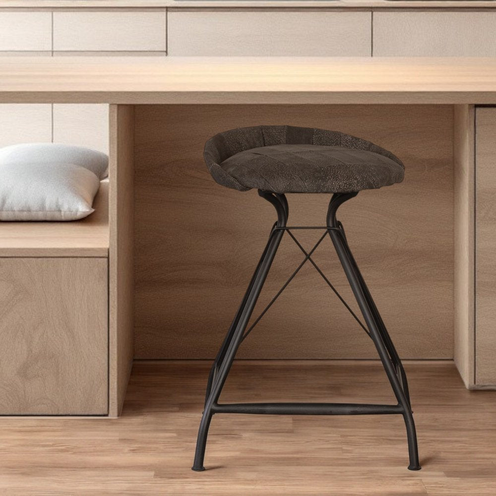 25" Brown and Black Leather and Iron Low Back Counter Height Swivel Bar Chair
