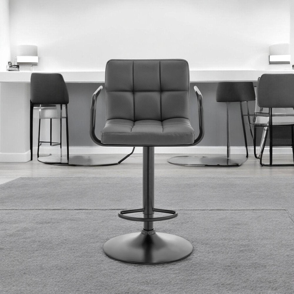 This 45" gray faux leather and iron swivel adjustable height bar chair will be the perfect way to add some cool design and utility to your space similar to what you find in your favorite cafes or pubs. Quality construction from matte black iron combines with gray faux leather to give this stool a fresh and updated look. A full back mixed with a round shaped seat design makes this chair both comfortable and fashionable. The armchair design gives you a great place to comfortably rest your arms. 45" H x 21" W x 20" D