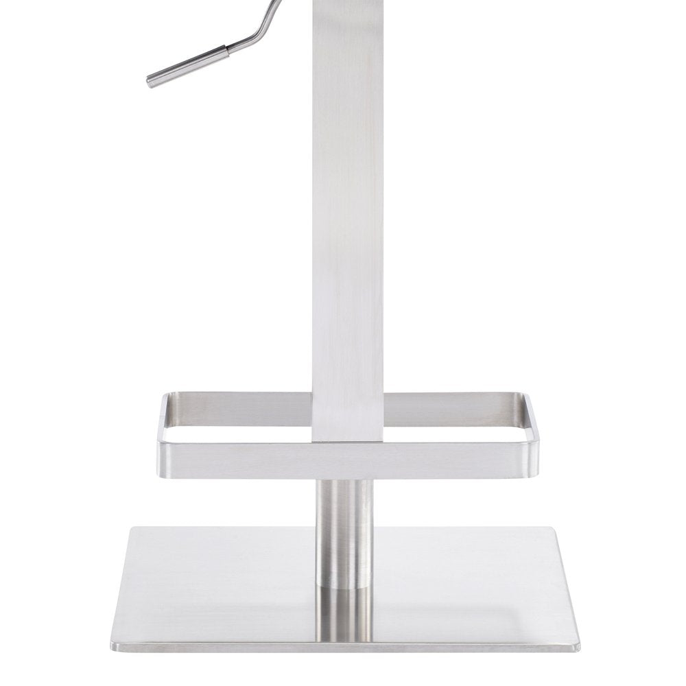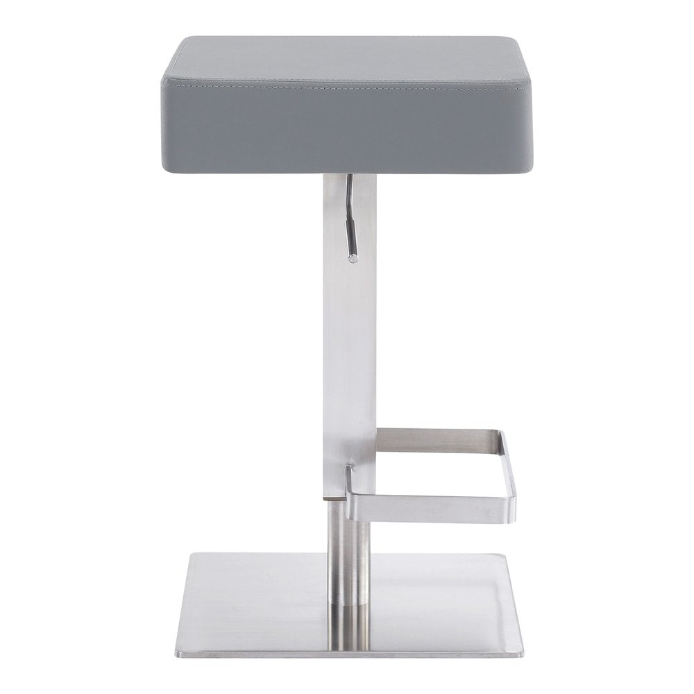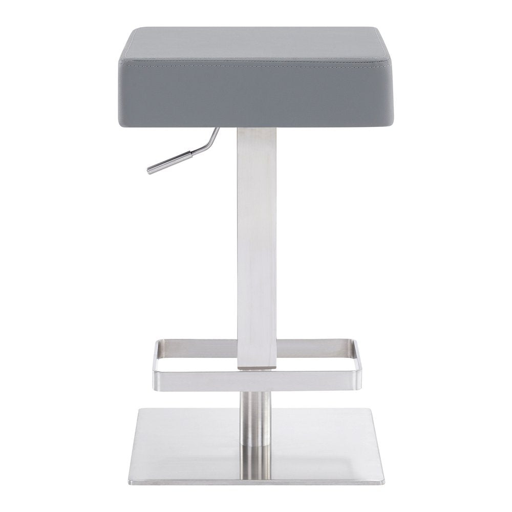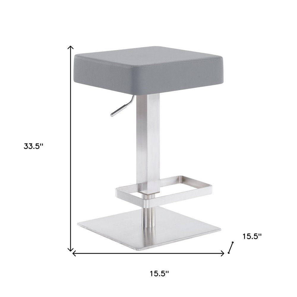The perfect way to add some extra seating in your home, this 34" gray faux leather and iron swivel backless adjustable height bar chair will elevate the look and vibe of your room. The gray faux leather seat of this stool is a nice contrast to the high quality, brushed stainless steel iron of the base. A backless mixed with a round shaped seat makes this chair both comfortable and fashionable. A great seating option, this stool will bring a unique look to any room. 33.5" H x 15.5" W x 15.5" D