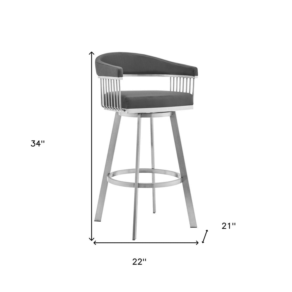 With this 25-inch gray and silver iron swivel backless counter height bar chair with footrest you can add design and extra seating to your space. The silver coloration of the high quality iron base marries nicely with the gray fabric seat. A backless mixed with a round shaped seat makes this chair both comfortable and fashionable. Designed with armrests for your comfort, this chair also features a footrest for comfort and convenience. 34-inch H x 22-inch W x 21-inch D