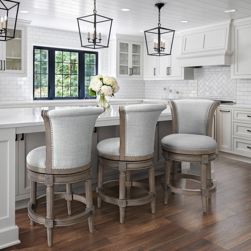 The perfect way to add some extra seating in your home, this 25-inch gray solid wood and fabric counter height swivel bar chair will elevate the look and vibe of your room. A sleek gray monotone color gives this solid wood and upholstered stool a fresh and updated look. Designed with a footrest for comfort and convenience. The round shape of the seat combines with a high full back to give this chair a comfortable and fashionable look. 40-inch h x 24-inch w x 20.25-inch d.