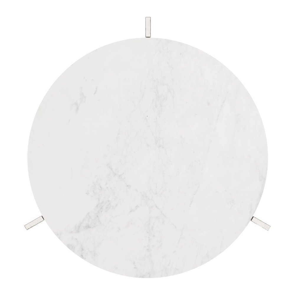 Distinctive in style the 25-inch white and silver marble and aluminum round cross legs end table radiates a versatile charm. Quality construction from the silver aluminum base combines with white marble of the top to give this table a fresh and updated look. An ideal location for placing your snacks and drinks, and a place to keep your lamp, frames, or other accessories. This versatile table is a great accent for most any room. 24.8-inch h x 20-inch w x 20-inch d.