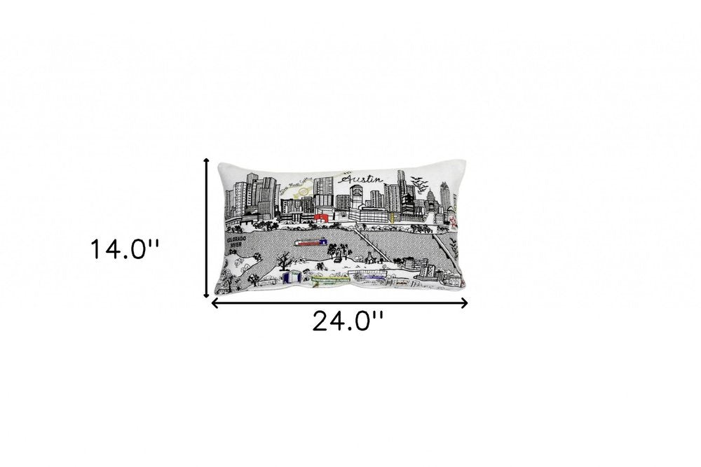 Showcase this famous city, with our Austin Daylight Skyline Standard Size Lumbar Decorative Pillow. The daylight view of Austin that includes the Colorado River and Lady Bird Lake, is picture perfect. The gorgeous art features many famous landmarks and references for this destination city, rendering a modern whimsical way to bring this iconic cityscape to life. Made of a wool/nylon blend, this high quality stitched decorative pillow features black on white embroidered artwork mixed with pops of color that highlight important and recognizable icons from this popular and bustling Texas city. This pillow makes a great gift, decorative accent and conversation piece. 14-inch H x 25-inch W x 4-inch D