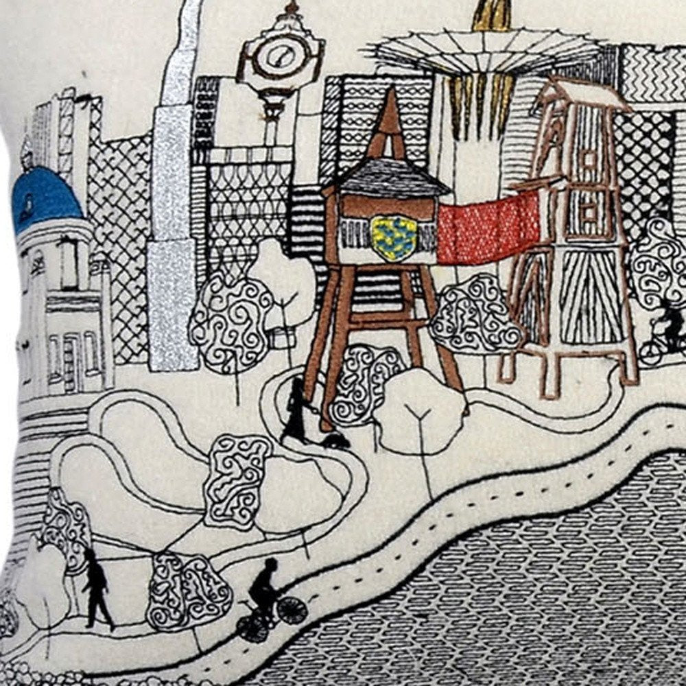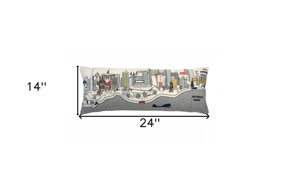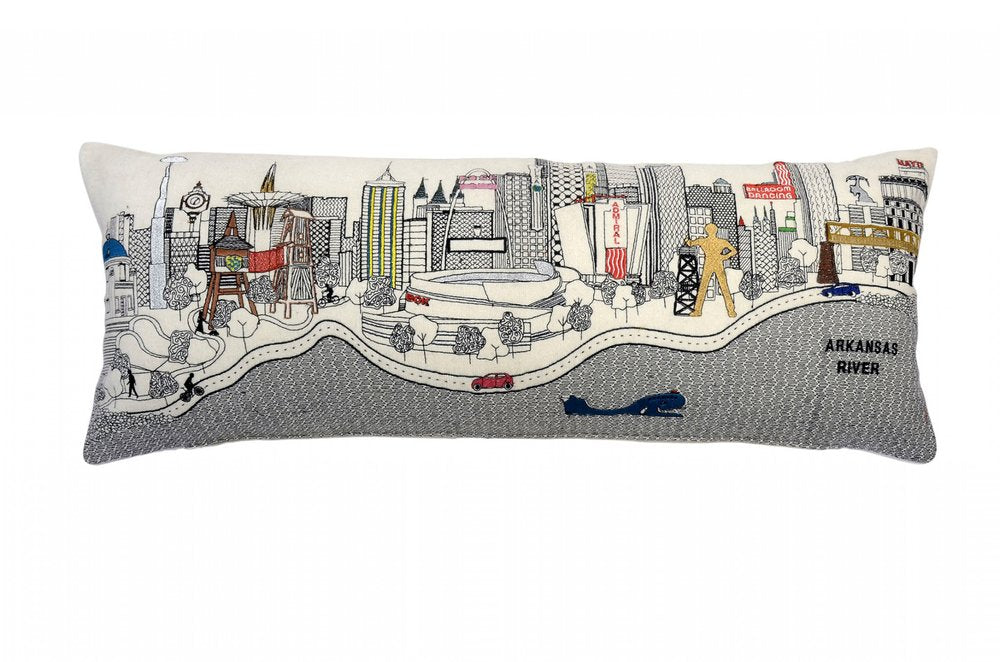 Showcase this famous city, with our Tulsa Daylight Skyline Standard Size Lumbar Decorative Pillow. The daylight view of Tulsa from the Arkansas River, is picture perfect. The gorgeous art features many famous landmarks and references for this destination city, rendering a modern whimsical way to bring this iconic cityscape to life. Made of a wool/nylon blend, this high quality stitched decorative pillow features black on white embroidered artwork mixed with pops of color that highlight important and recognizable icons from this popular and bustling city. This pillow makes a great gift, decorative accent and conversation piece. 14-inch H x 25-inch W x 4-inch D