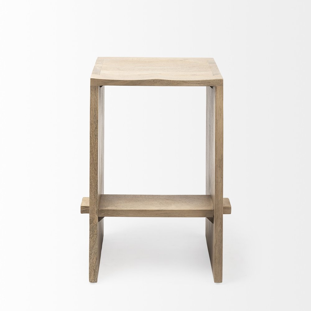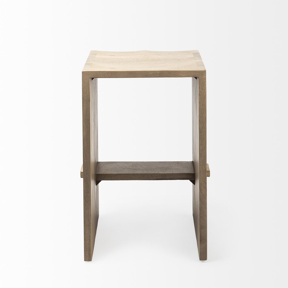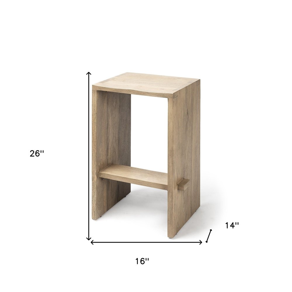 Comfort and design come together nicely in this 26-inch brown solid and manufactured wood backless counter height bar chair with footrest. The base of this stool is made from solid and manufactured wood in a brown, that matches the solid and manufactured wood, also in brown. A backless mixed with a square shaped seat makes this chair both comfortable and fashionable. 26-inch H x 14-inch W x 16-inch D