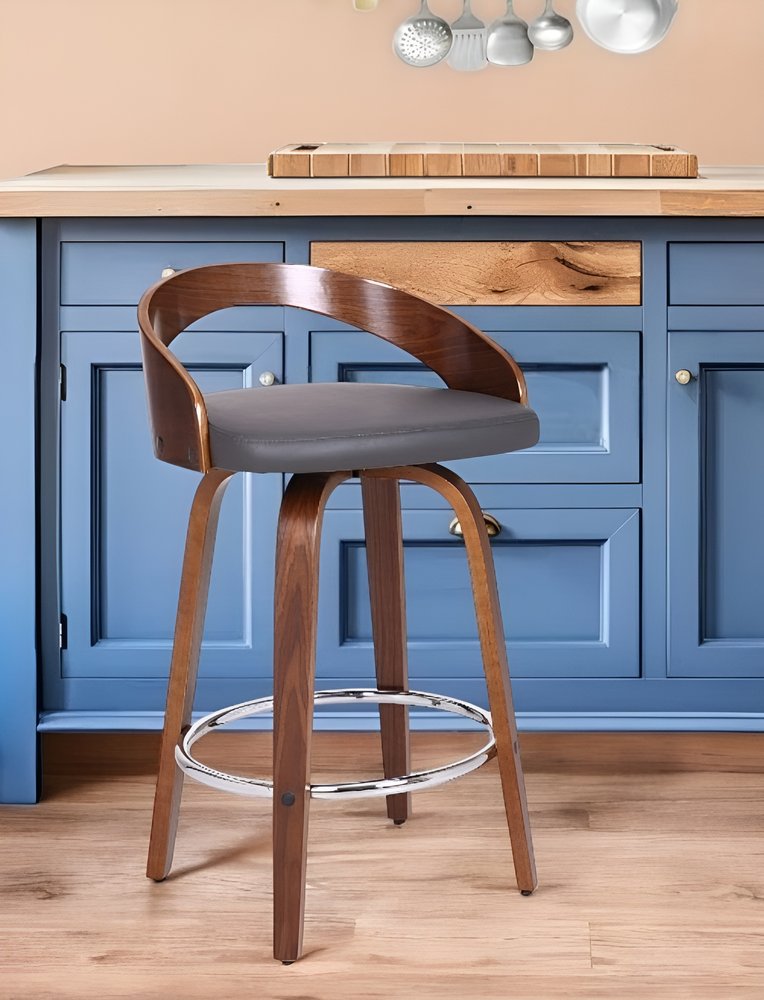 Comfort and design come together nicely in this 26-inch gray and brown faux leather and iron low back counter height swivel bar chair. The base of this stool is made from iron in a brown color that is a nice contrast to the gray faux leather seat. A low back mixed with a round shaped seat design makes this chair both comfortable and fashionable. Designed with a footrest for comfort and convenience. 31-inch H x 19-inch W x 19-inch D