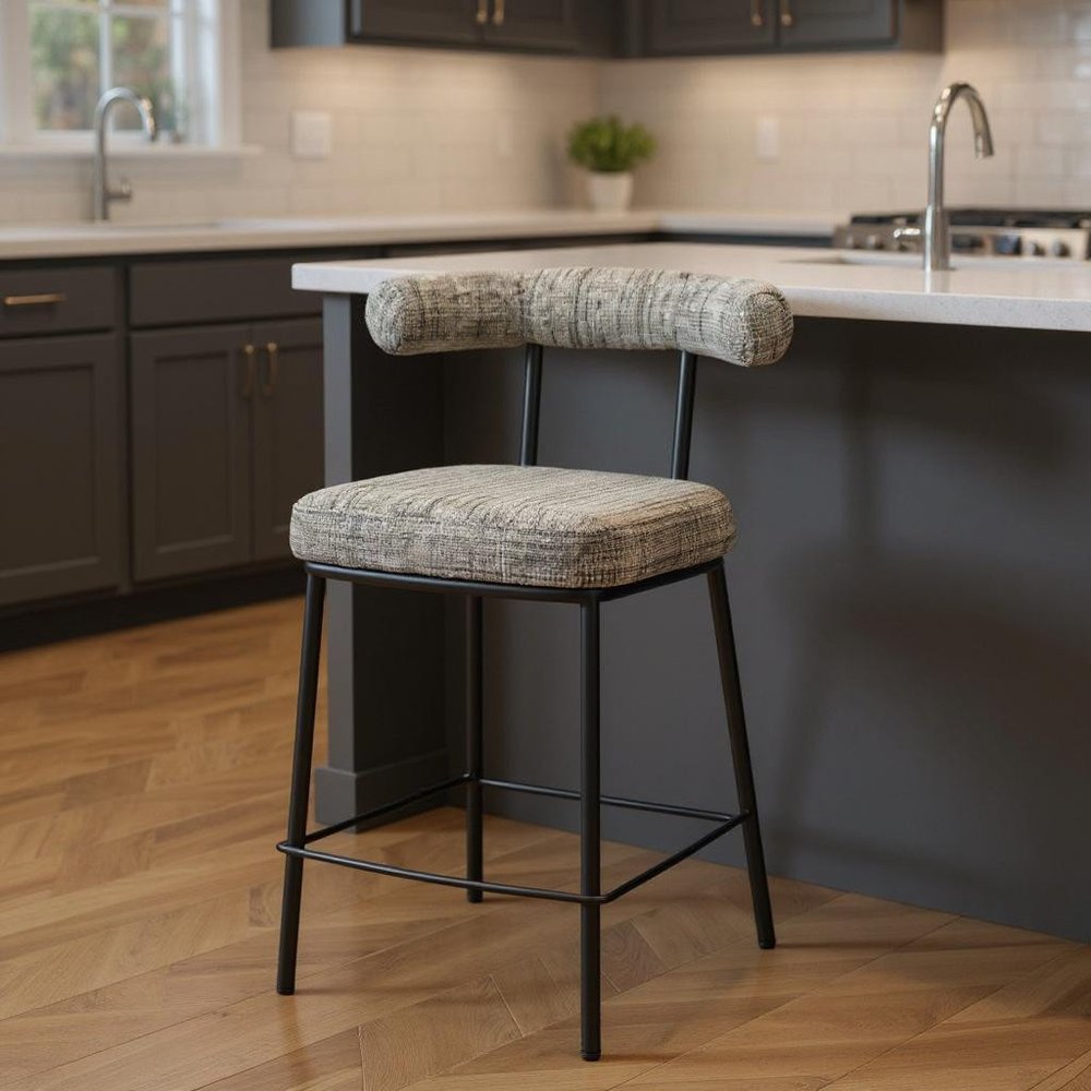 With this 26-inch green and black chenille and steel low back counter height bar chair you can add design and extra seating to your space. A black steel frame is finished off with a green upholstered seat that is the epitome of quality construction and design. A low back mixed with a bucket shaped seat design makes this chair both comfortable and fashionable. 36.20-inch h x 22.40-inch w x 20.50-inch d.