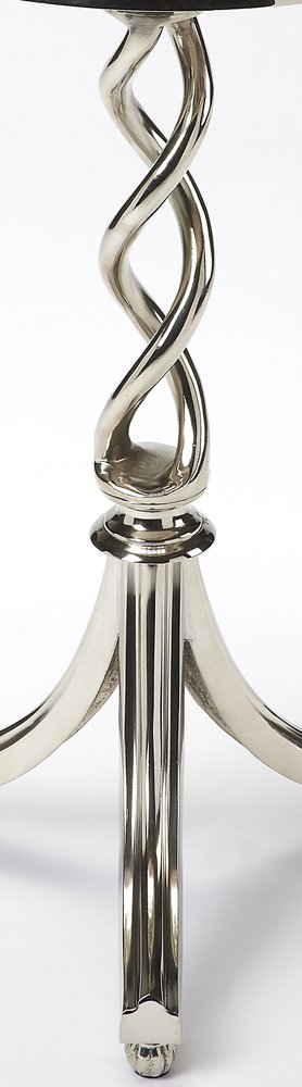 Distinctive in style the 26" silver aluminum round end table radiates a versatile charm. This table is made from aluminum in a silver color throughout the base and top. The top has an open and airy braided lattice design. The purposefully distressed finish gives this table an authentically rustic feel. A great accent on either side of the sofa or bed, this adorable end or side table is just what you need. You can also use it as an entryway table to hold your keys. 25.75" H x 17.5" W x 17.5" D