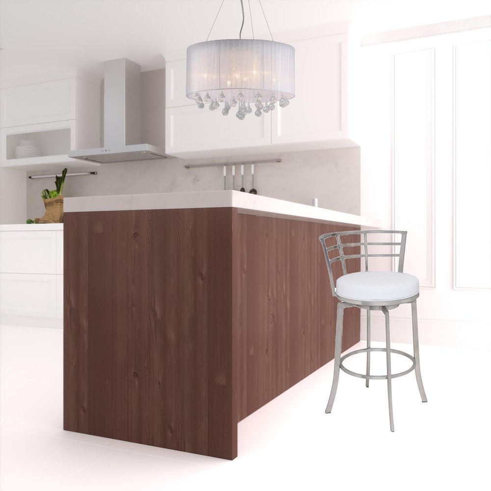 Comfortable enough to sit in for awhile, this 35" white faux leather and iron swivel low back counter height bar chair will transcend the look of your room. The base of this stool is made from iron in a brushed stainless steel color that is a nice contrast to the white faux leather seat. The round shape of the seat combines with a low back to give this chair a comfortable and fashionable look. A great seating option, this stool will bring a unique look to any room. 35" H x 20" W x 21" D