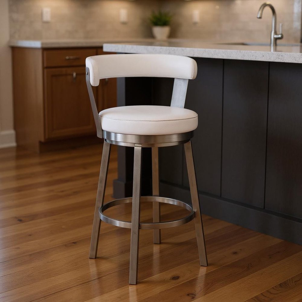 The perfect way to add some extra seating in your home, this 26-inch white and silver iron swivel backless counter height bar chair with footrest will elevate the look and vibe of your room. The base of this stool is made from iron in a silver color that is a nice contrast to the white fabric seat. A backless mixed with a round shaped seat makes this chair both comfortable and fashionable. Designed with a footrest for comfort and convenience. 36-inch H x 21-inch W x 19-inch D