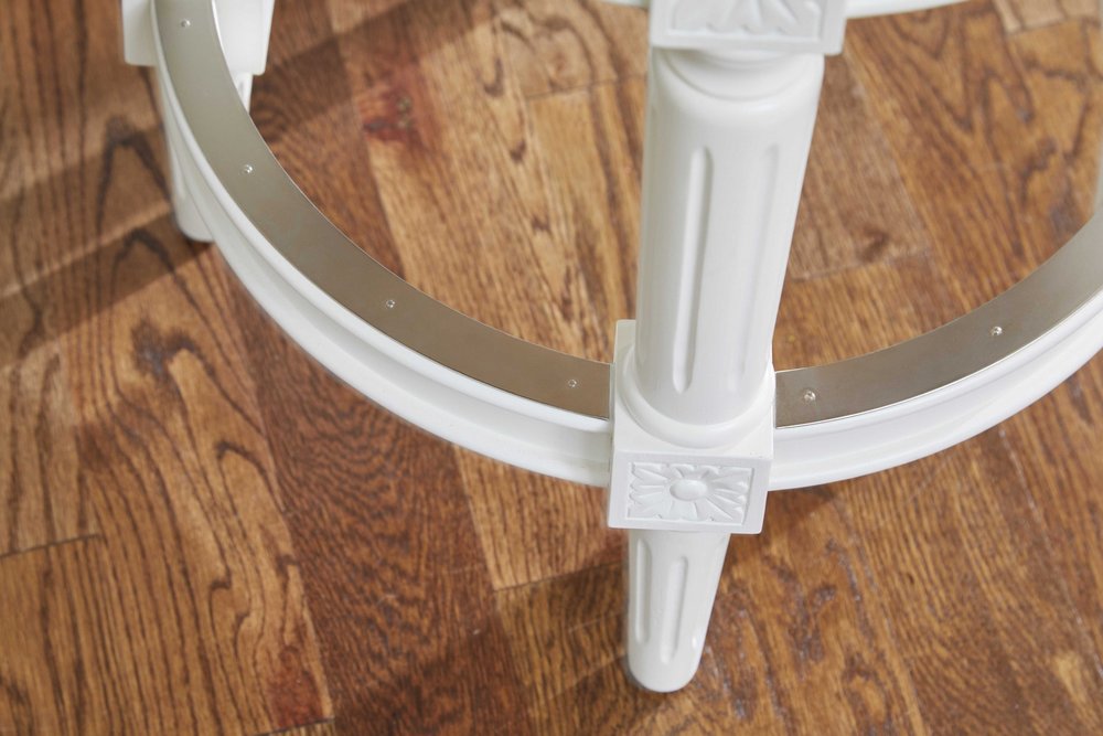 Comfort and design come together nicely in this 26-inch white solid wood and fabric backless counter height swivel bar chair. A sleek white monotone color gives this solid wood and fabric stool a fresh and updated look. The addition of nail head trim gives this chair added dimension. Not only good looking and stylish, this chair features a round shaped seat and a backless design for the ultimate in comfort and enjoyment. 25.5-inch h x 18.5-inch w x 18.5-inch d.
