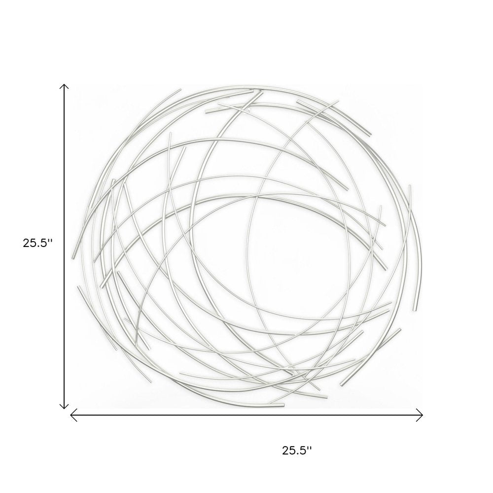 Elevate your living space with this striking modern wall decor featuring an abstract design. Crafted from sleek silver metal, this circular piece adds a contemporary touch to any room. Ideal for vertical display, it effortlessly becomes the focal point of your living room. Intriguing and stylish, this piece offers a unique interpretation of modern aesthetics. Bring a touch of sophistication to your space with this fabulous decor that effortlessly complements your existing furnishings. 25.5-inch h x 25.5-inch w x 1-inch d.