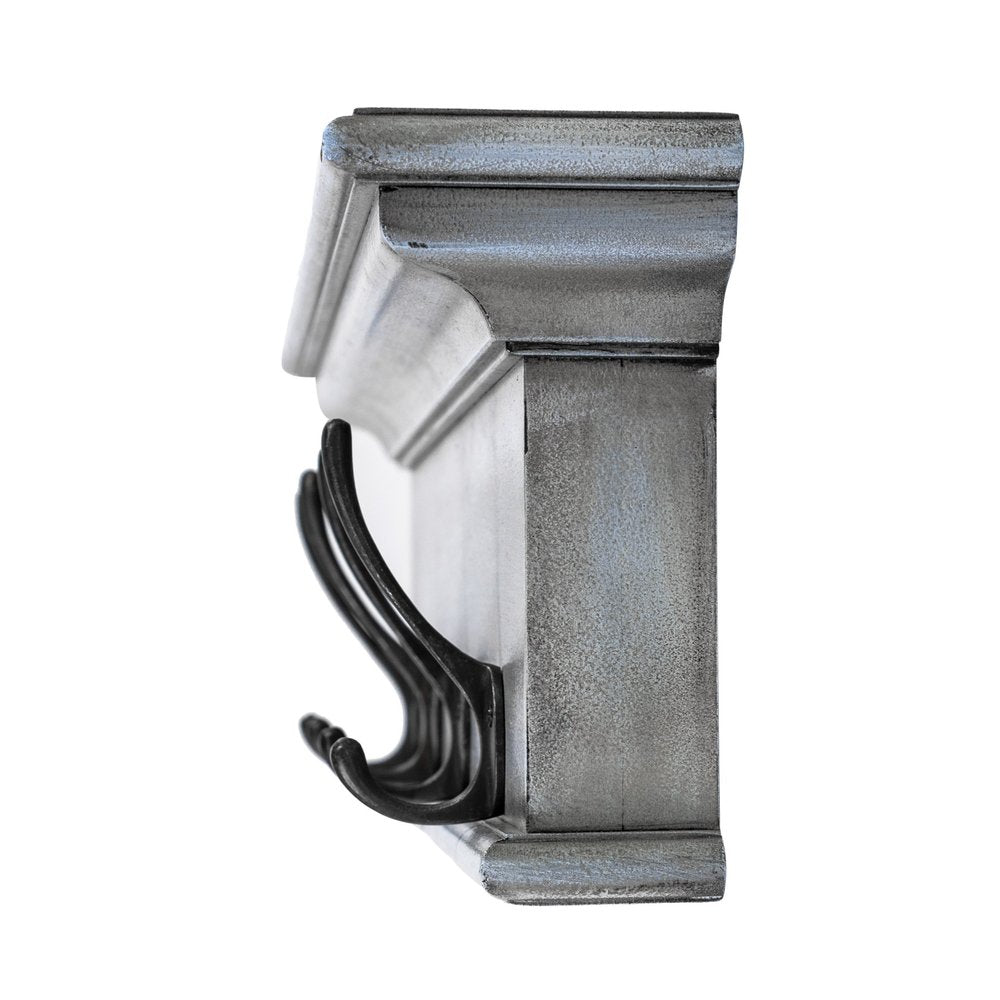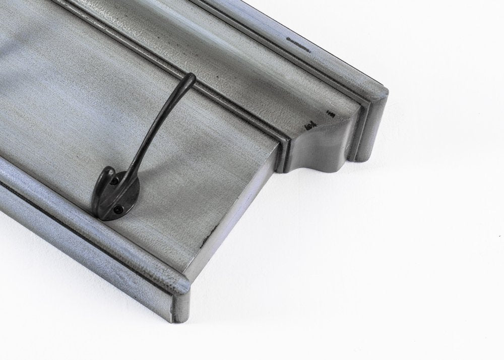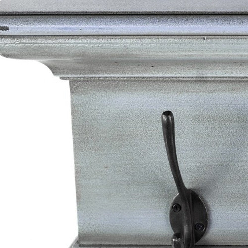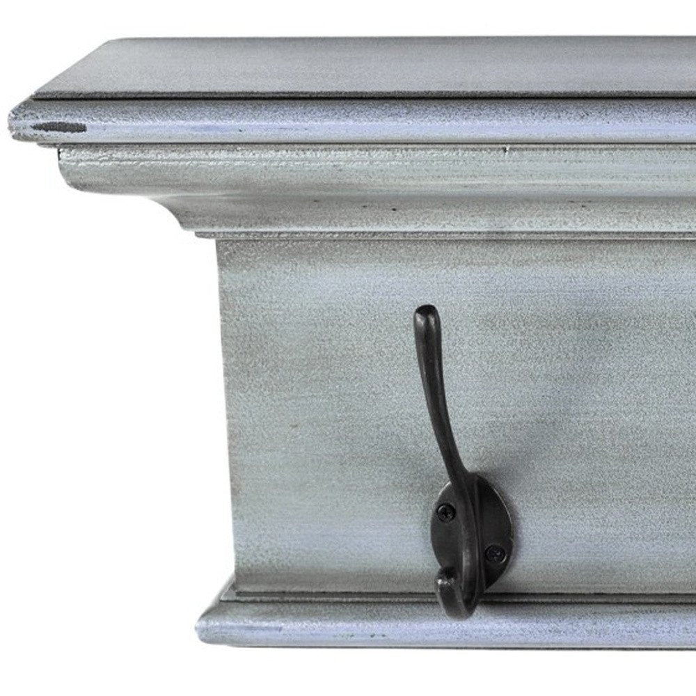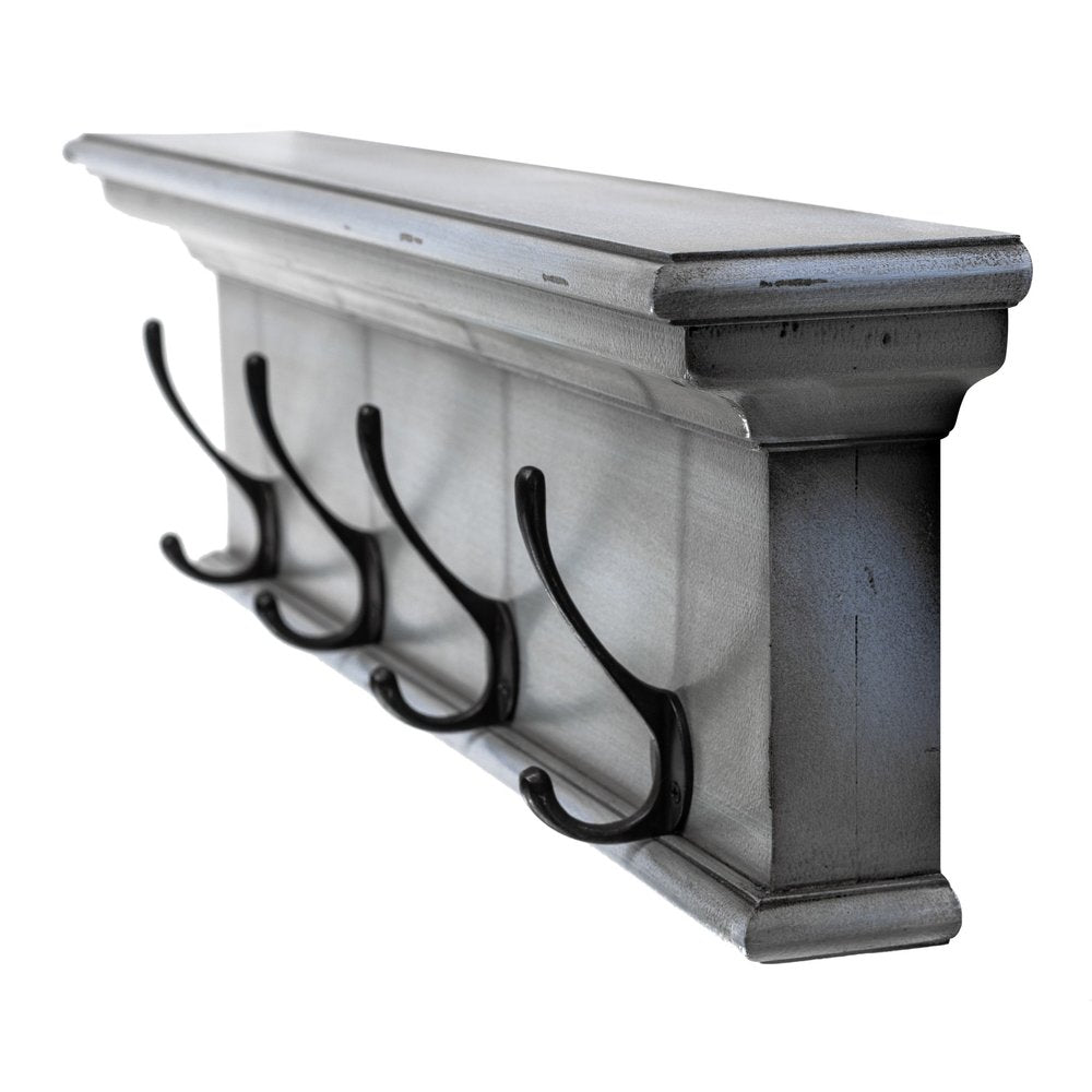 The 28-inch black and blue solid wood four hook wall mount coat rack adds a charming touch to your space. Designed in a cottage style, this coat rack beautifully complements various decor themes. This wall-mounted coat rack features a rustic design that enhances any space with its warmth and charm. Handcrafted from mahogany wood, with four large antiqued brass hooks, the rack has a whitewashed finish over the natural wood. Creatively fashioned to include a small shelf, the top of the rack has just the right amount of space to display decorative artifacts or even small plants. Crown moldings adorn the top of the shelf to complete the traditional look of this rack. The large multipurpose hooks are built to support anything from keys and coats to handbags as well.7.87-inch h x 27.56-inch w x 3.94-inch d.