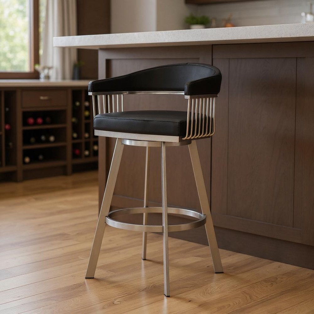Bring a trendy bar vibe to your space, with this 29-inch black and silver iron swivel backless bar height bar chair with footrest. The silver coloration of the high quality iron base marries nicely with the black fabric seat. A backless mixed with a round shaped seat makes this chair both comfortable and fashionable. Designed with armrests for your comfort, this chair also features a footrest for comfort and convenience. 38-inch H x 22-inch W x 21-inch D