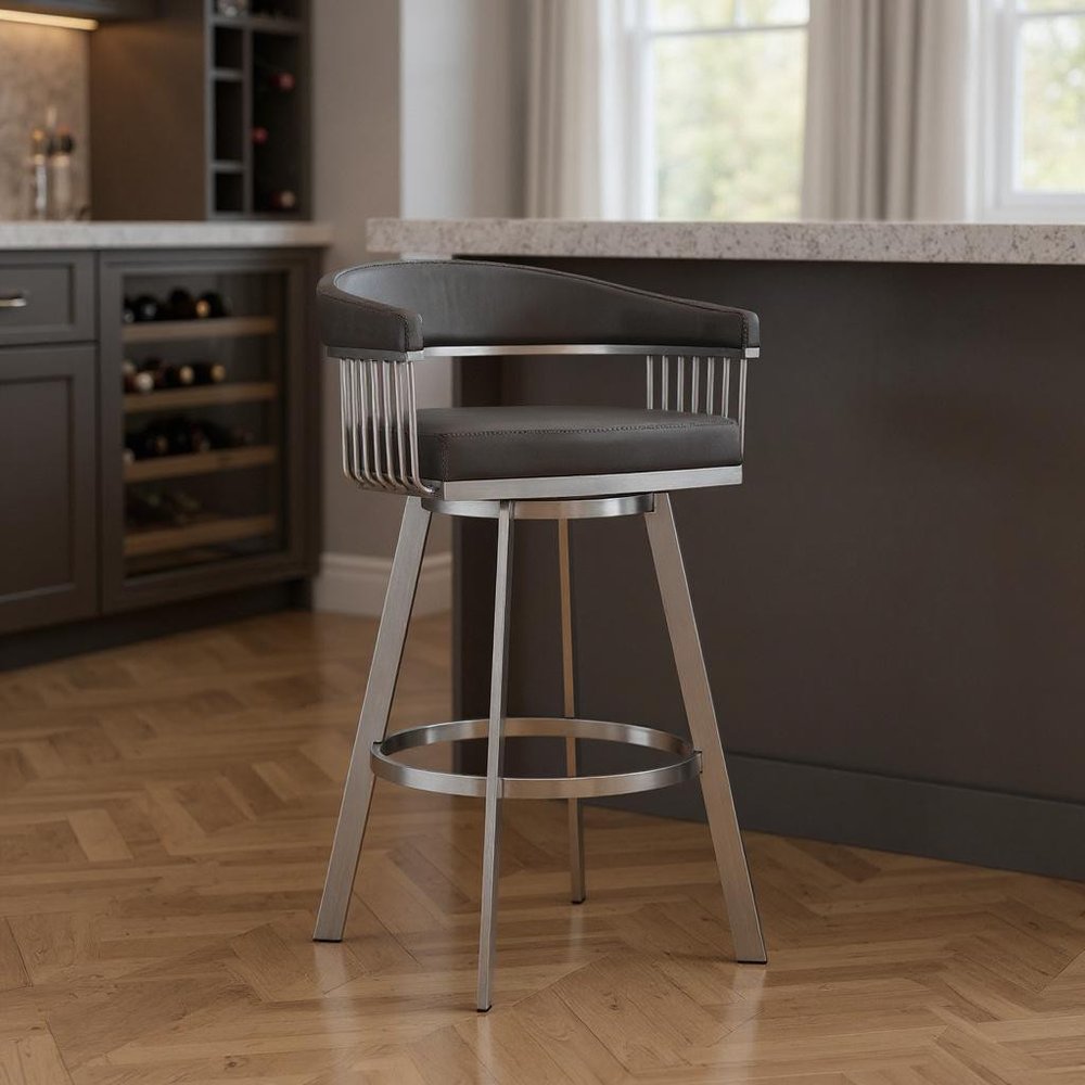 With this 29-inch gray and silver iron swivel backless bar height bar chair with footrest you can add design and extra seating to your space. Quality construction from silver iron combines with gray fabric to give this stool a fresh and updated look. A backless mixed with a round shaped seat makes this chair both comfortable and fashionable. Designed with armrests for your comfort, this chair also features a footrest for comfort and convenience. 38-inch H x 22-inch W x 21-inch D