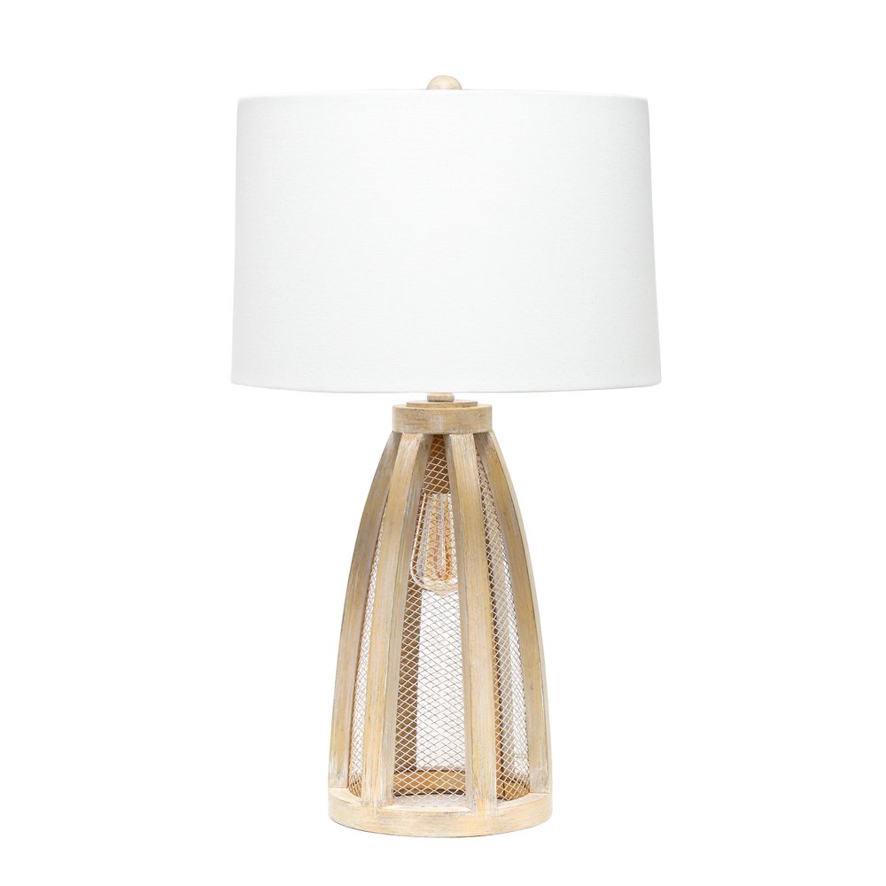Bring of level of elegance and freshness to your space with this high quality 29-inch natural and white manufactured wood and metal round table lamp with white drum shade. The base of this lamp is made of manufactured wood and metal finished in a natural and white tone. The white shade has a drum shape and is made of fabric, which makes it a perfect choice. This standard table lamp is designed to provide general lighting to the area. The light that this lamp throws is soft and warm to elevate the look of most any space in your home. It is perfect for virtually any decor. 29.00-inch h x 17.00-inch w x 17.00-inch d.