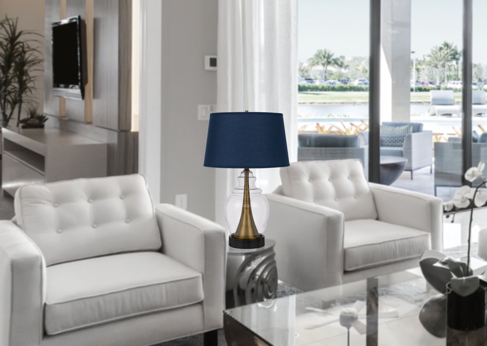 Bring of level of elegance and freshness to your space with this high quality 30" antiqued brass and glass table lamp with navy blue empire shade. The base of this lamp is made of metal finished in a antiqued brass tone. Includes a navy blue fabric, empire shaped shade, making this a fashionable piece that will complement most any interior. This standard table lamp is designed to provide general lighting to the area. High quality design makes this a great lamp for not only lighting, but accenting a room with style. The perfect lamp to create just the right natural and soothing light in your space. 30" H x 19" W x 19" D
