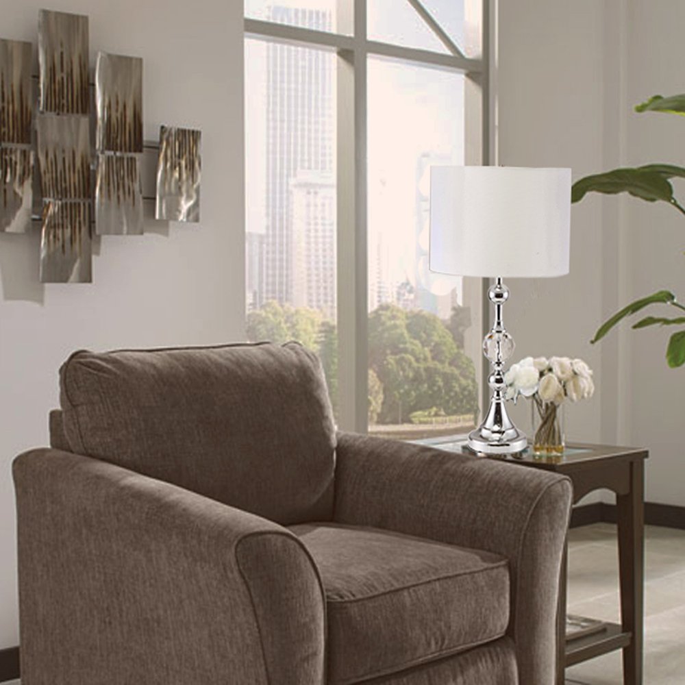 Bring of level of elegance and charm to your space with this good looking 30" silver metal table lamp with white classic drum shade. The base of this lamp is made of silver metal. The silver of this lamp creates a nice contrast with the white fabric classic drum shaped shade. High quality design makes this a great lamp for not only lighting, but accenting a room with style. Bring some lite and good vibes into your space with this updated and stylishly designed lamp. 29.5" H x 15" W x 15" D